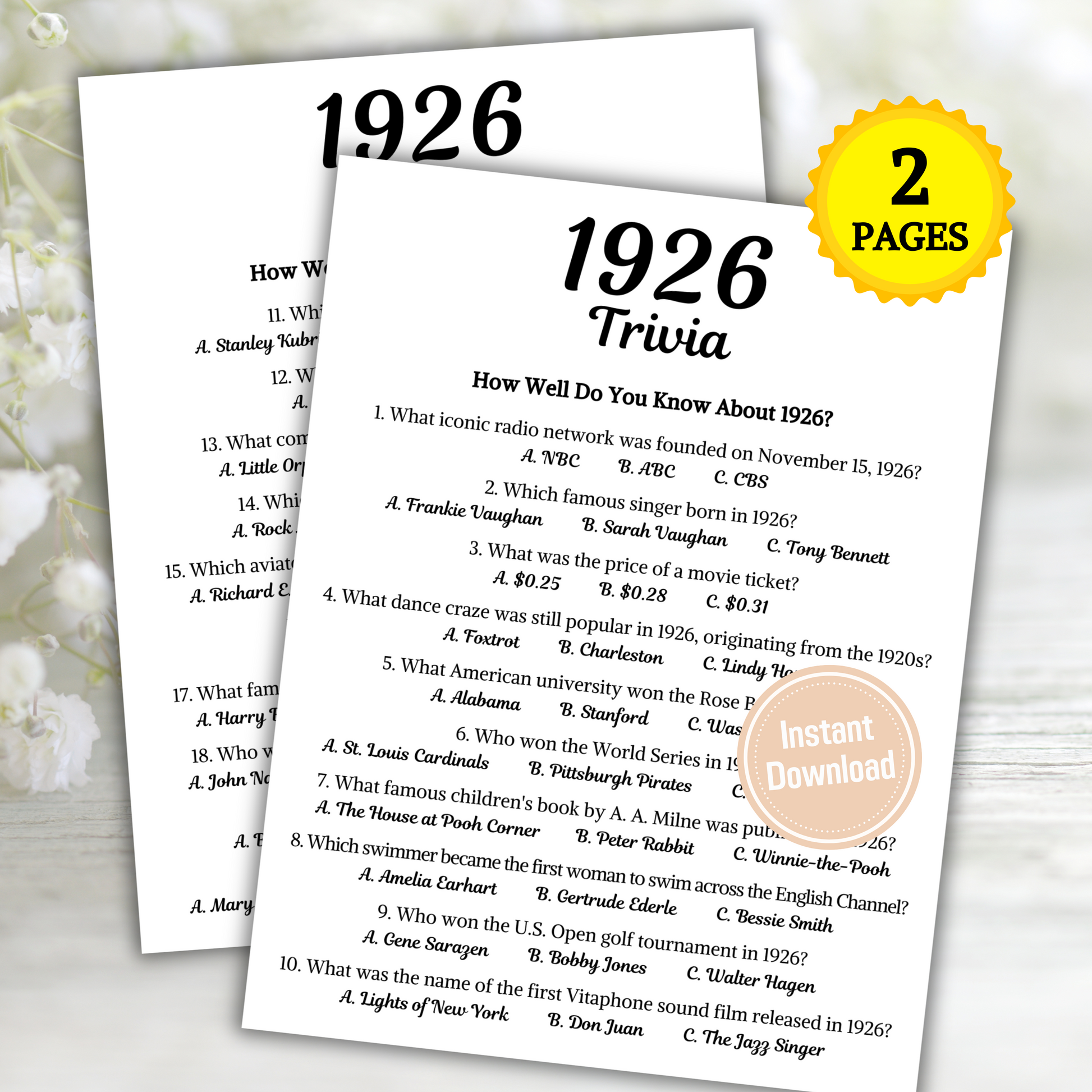 - A file included 2 Pages 1926 Trivia Game (8.5" x 11") (Questions).