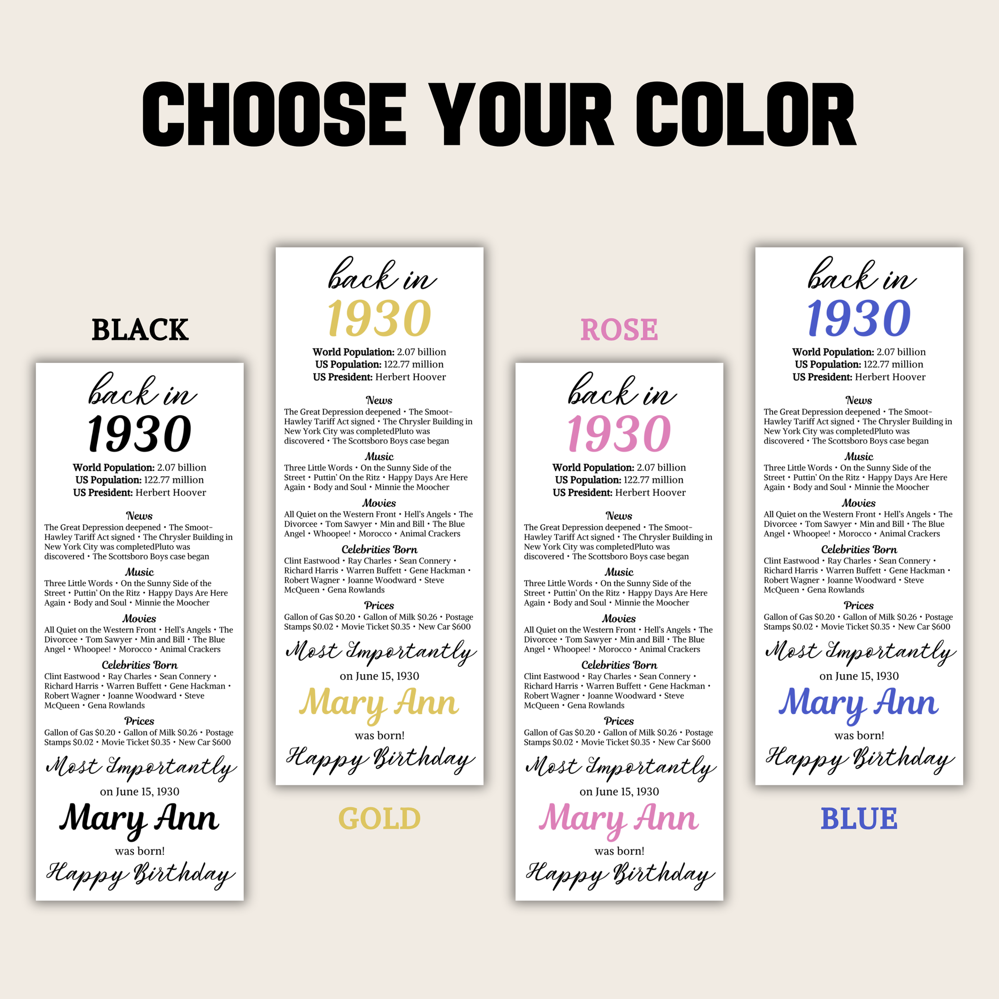 Expertly crafted, they showcase personalized news and cultural milestones tailored specifically for individuals born in 1930.