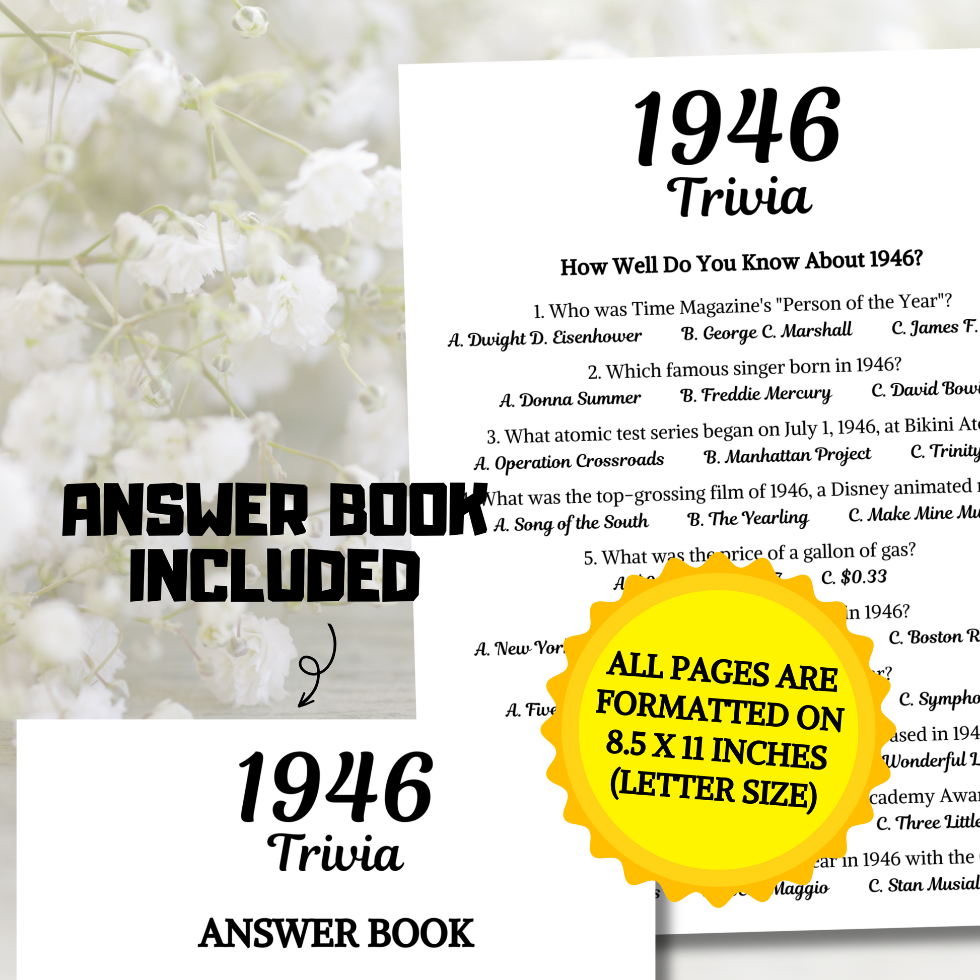 - A file included 2 Pages 1946 Trivia Game (8.5" x 11") (Questions).