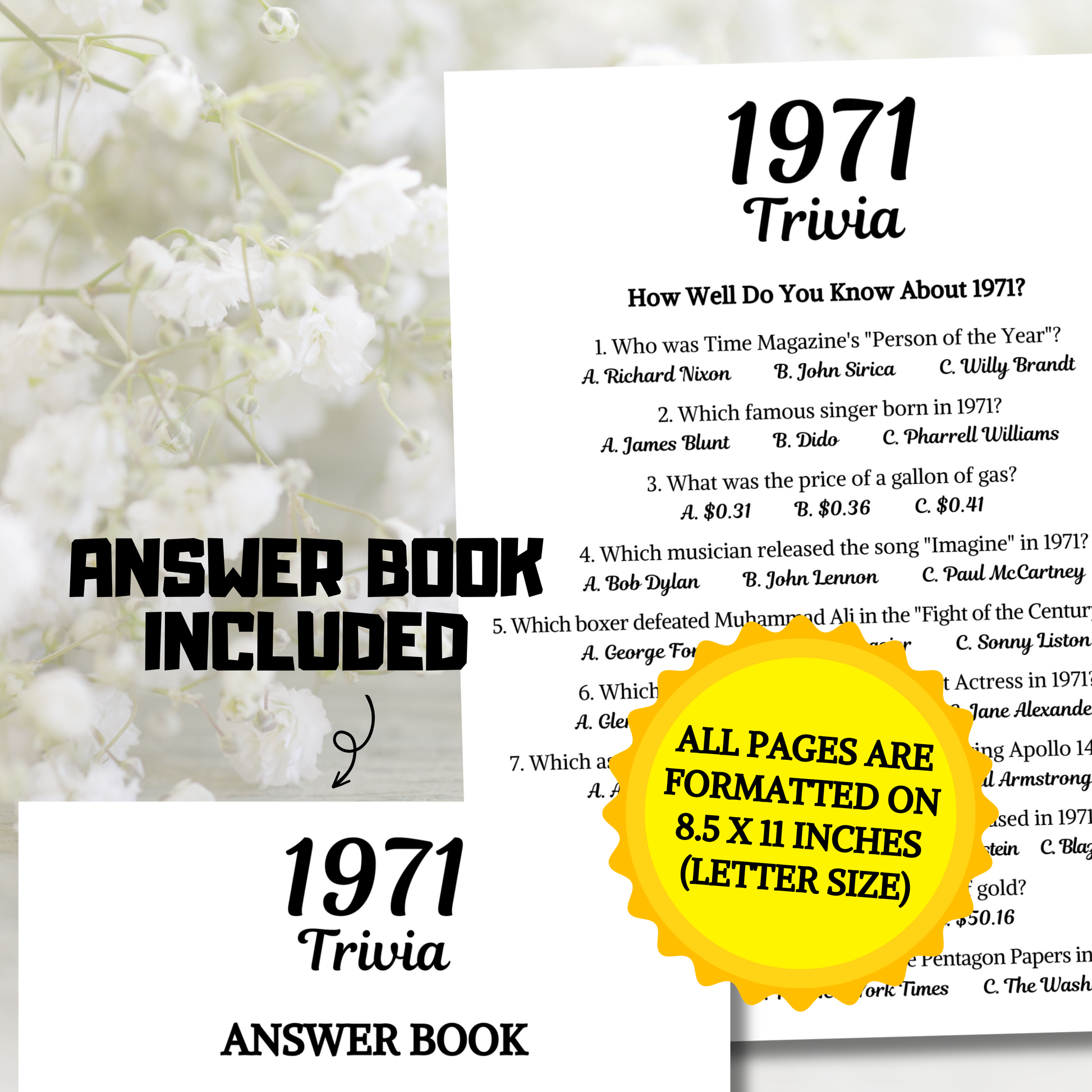 - A file included 2 Pages 1971 Trivia Game (8.5" x 11") (Questions).