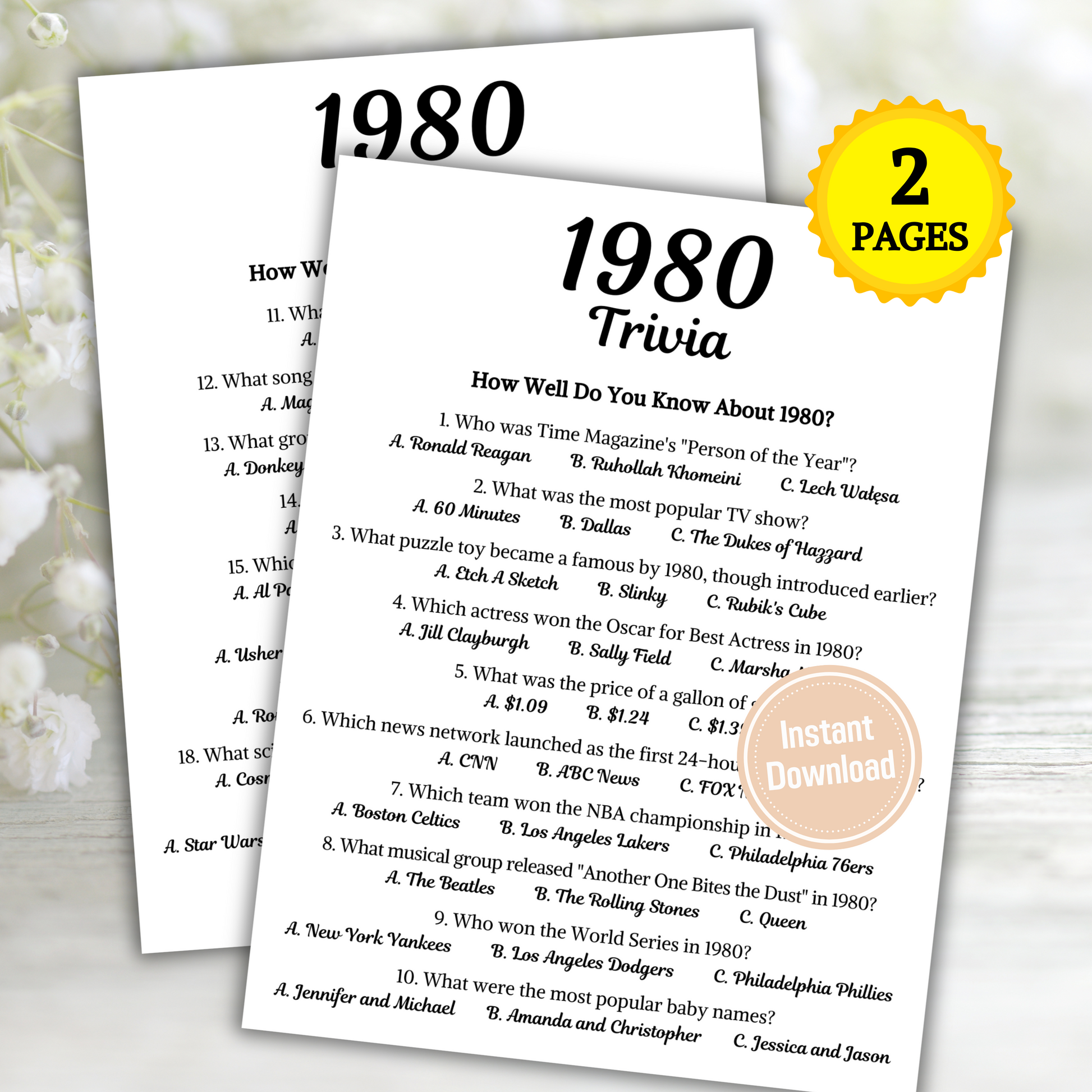 Discover the iconic moments and milestones of 1980 with our 1980 Trivia Game, a comprehensive and engaging experience that transports you back to the bold and vibrant decade. Perfect for trivia lovers, history enthusiasts, and anyone looking to relive the past, this game is a must-have for all things 1980.