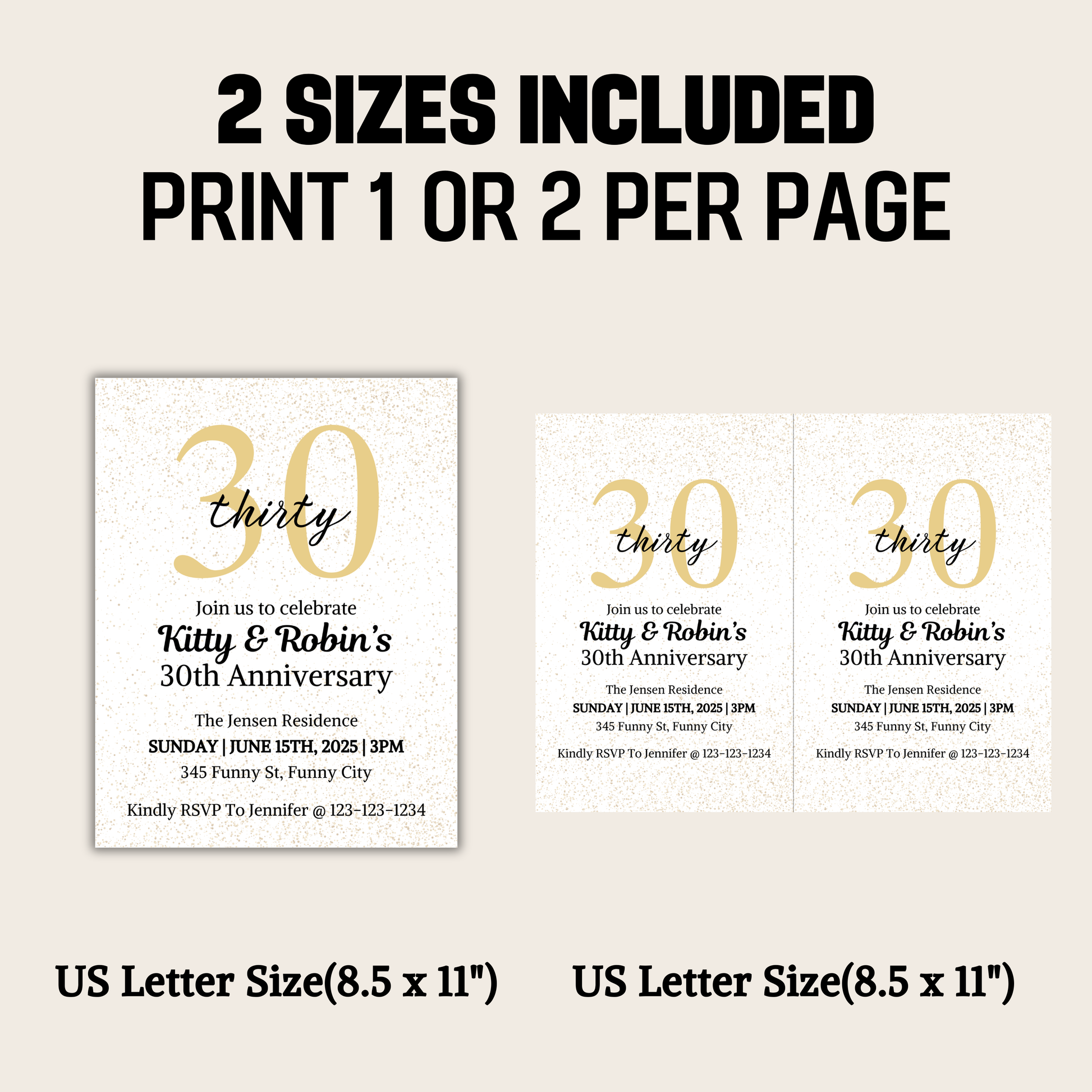 30th Anniversary Invitation is an editable Anniversary invitation. You can edit/delete/add any words you like. Available in US Letter size(8.5" x 11") and (11" x 8.5").