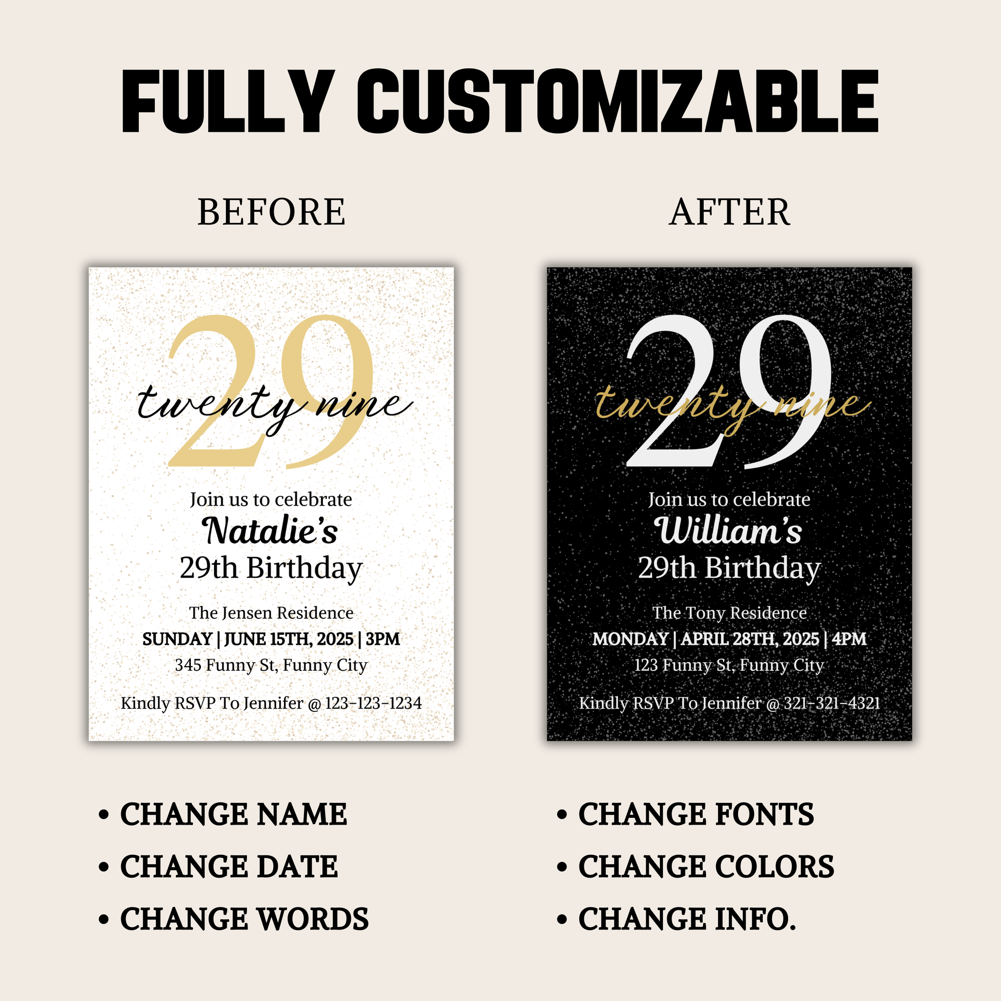 29th Birthday Invitation is an editable birthday invitation. You can edit/delete/add any words you like. Available in US Letter size(8.5" x 11") and (11" x 8.5").