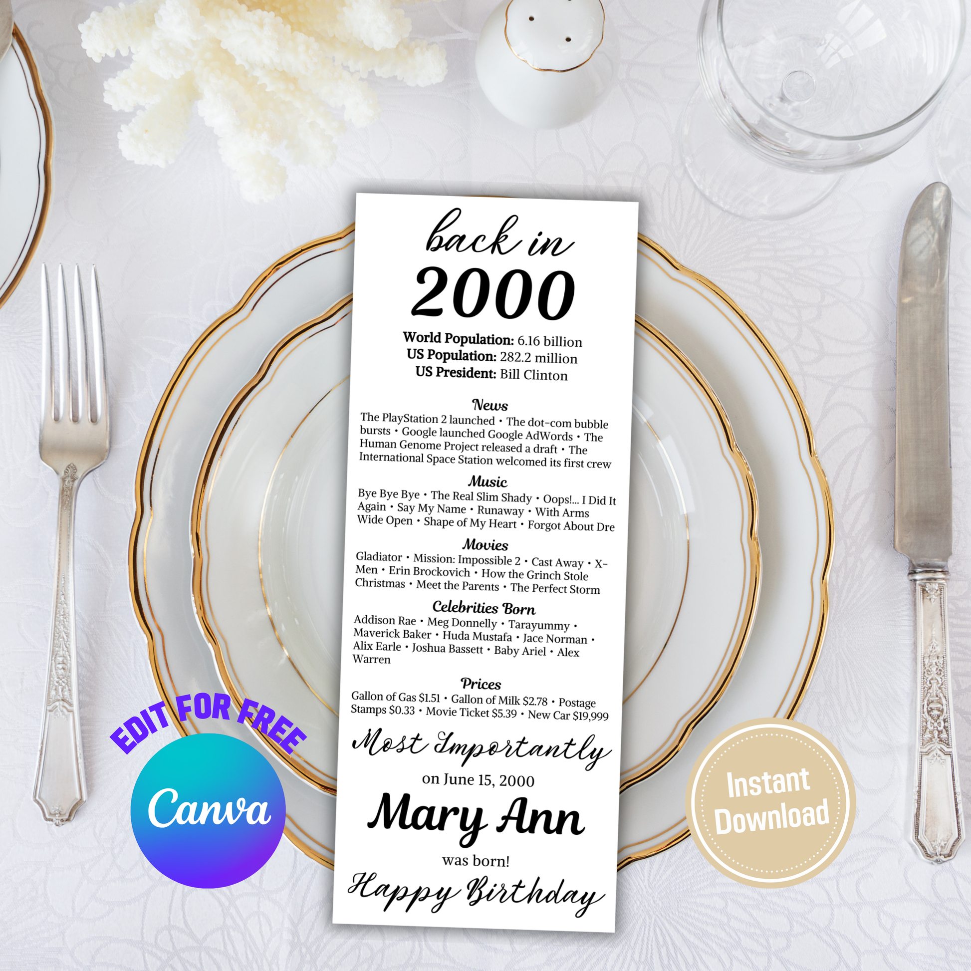Each card showcases personalized news and pop culture moments tailored specifically for individuals born in the year 2000, adding a unique and memorable touch to your event’s table settings.