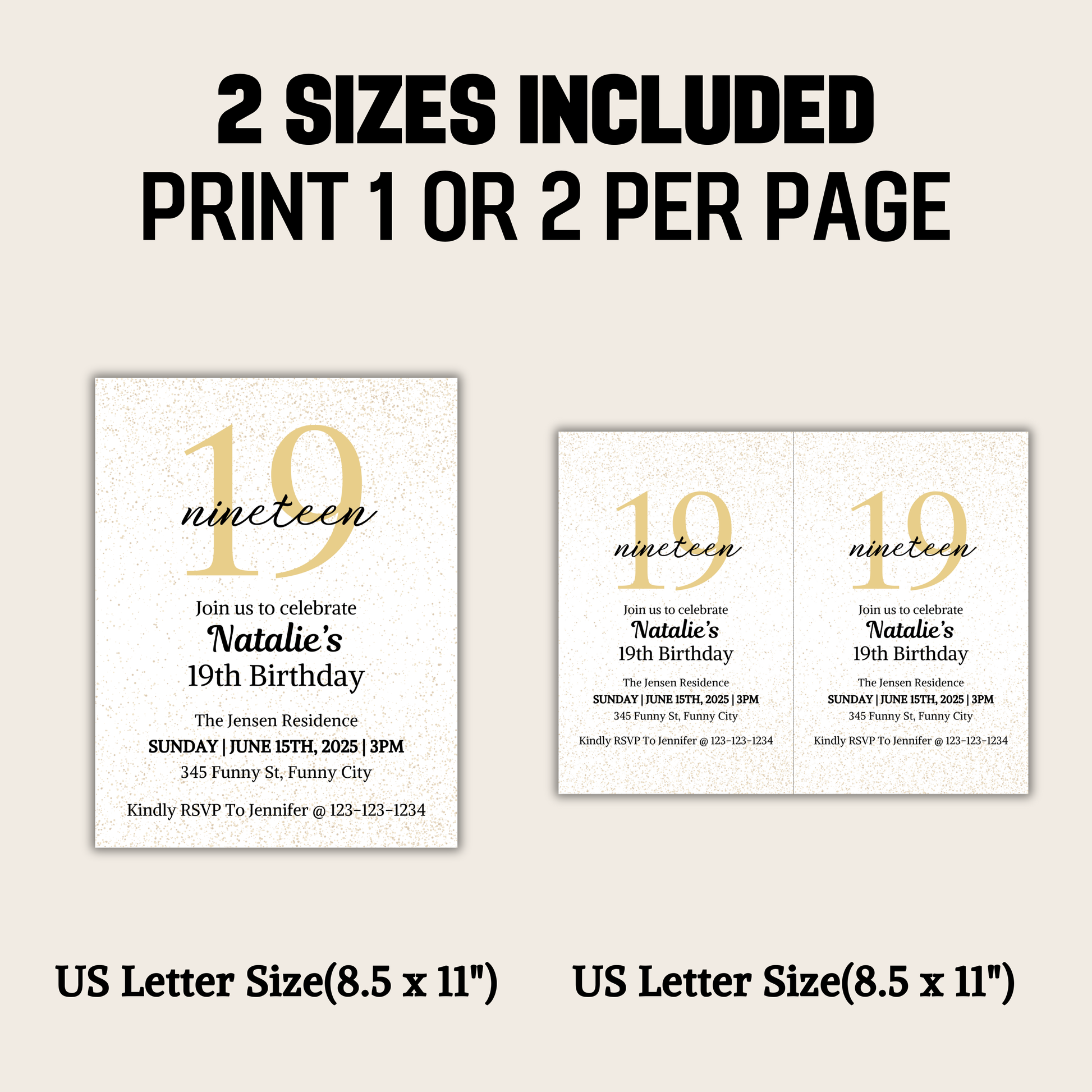 19th Birthday Invitation is an editable birthday invitation. You can edit/delete/add any words you like. Available in US Letter size(8.5" x 11") and (11" x 8.5").
