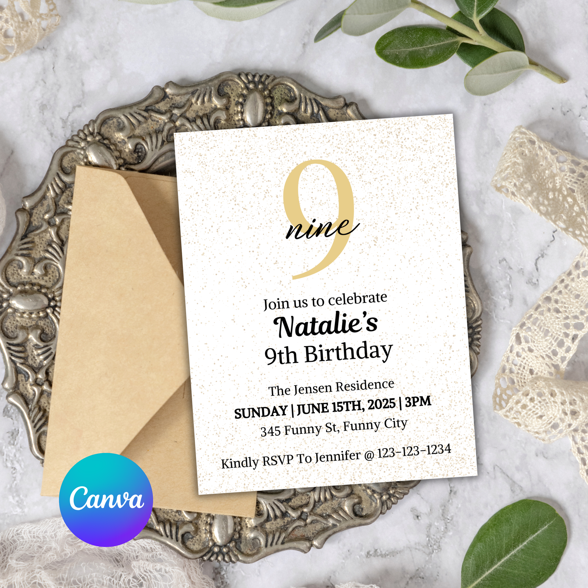 Make your child's ninth birthday celebration memorable with this fully editable invitation template. Designed for flexibility and ease, this digital invite lets you customize colors, typography, messaging, and layout to match your party vision. Download instantly, personalize in minutes, and distribute to guests via email or print. An efficient solution for coordinating party details while maintaining a polished, professional appearance that sets the right tone for the occasion.