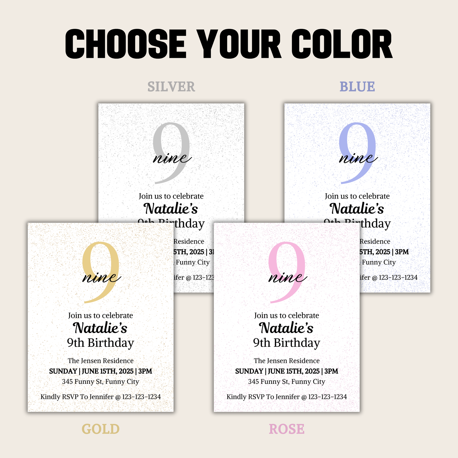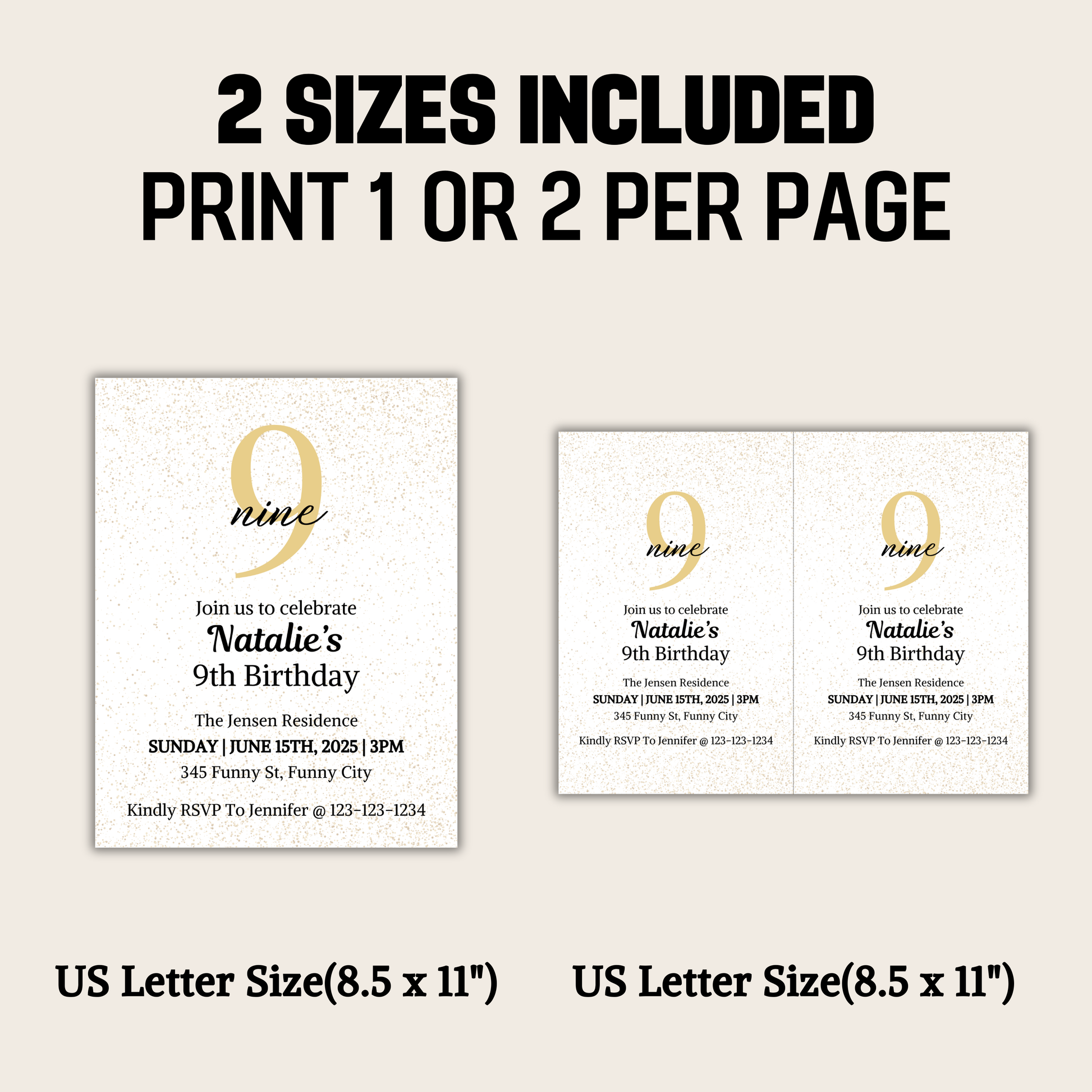 9th Birthday Invitation is an editable birthday invitation. You can edit/delete/add any words you like. Available in US Letter size(8.5" x 11") and (11" x 8.5").