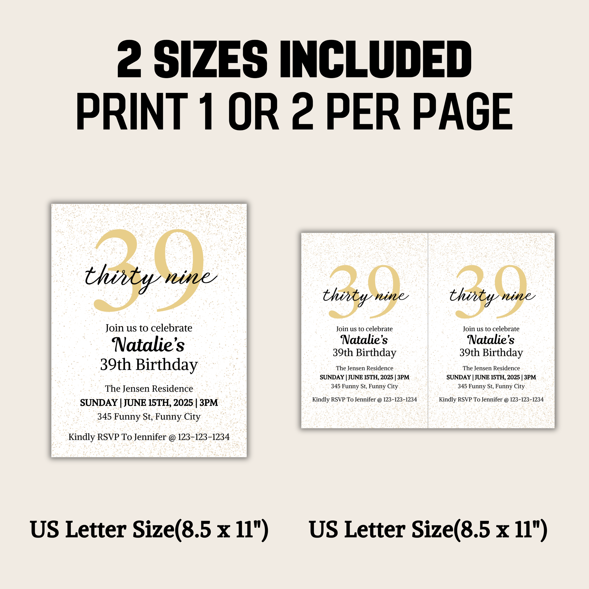 39th Birthday Invitation is an editable birthday invitation. You can edit/delete/add any words you like. Available in US Letter size(8.5" x 11") and (11" x 8.5").