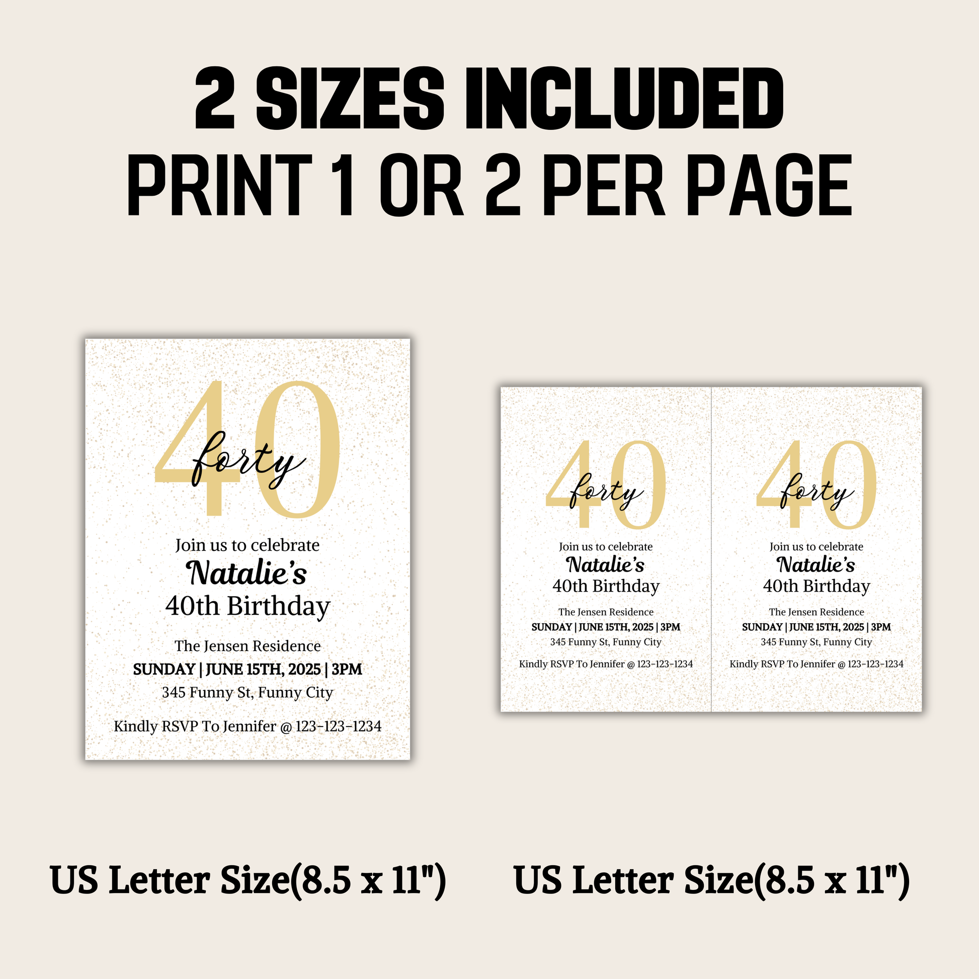 40th Birthday Invitation is an editable birthday invitation. You can edit/delete/add any words you like. Available in US Letter size(8.5" x 11") and (11" x 8.5").
