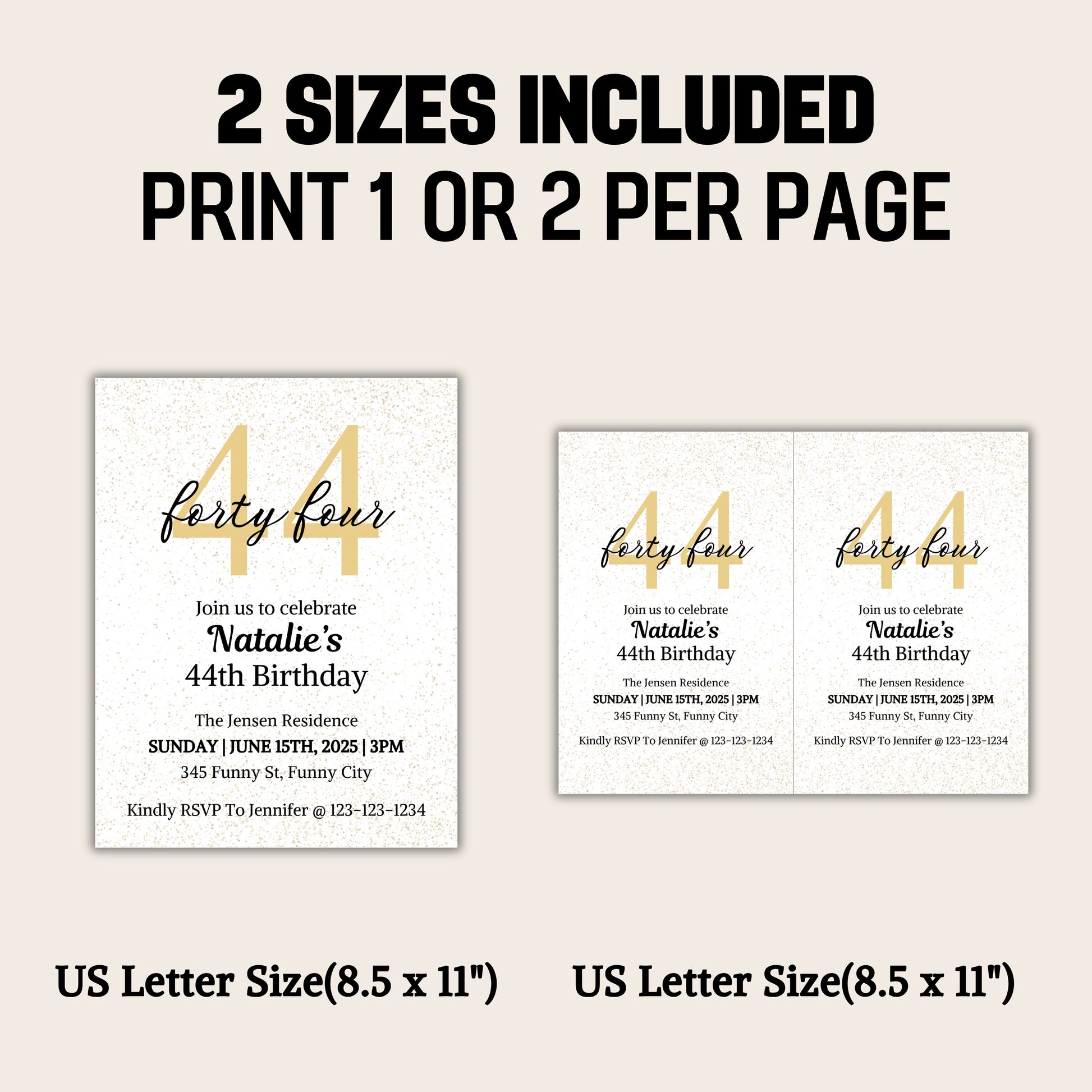 44th Birthday Invitation is an editable birthday invitation. You can edit/delete/add any words you like. Available in US Letter size(8.5" x 11") and (11" x 8.5").