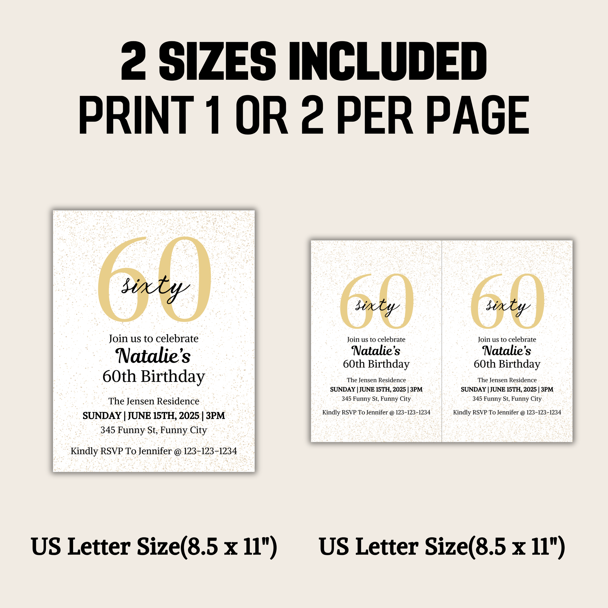 60th Birthday Invitation is an editable birthday invitation. You can edit/delete/add any words you like. Available in US Letter size(8.5" x 11") and (11" x 8.5").