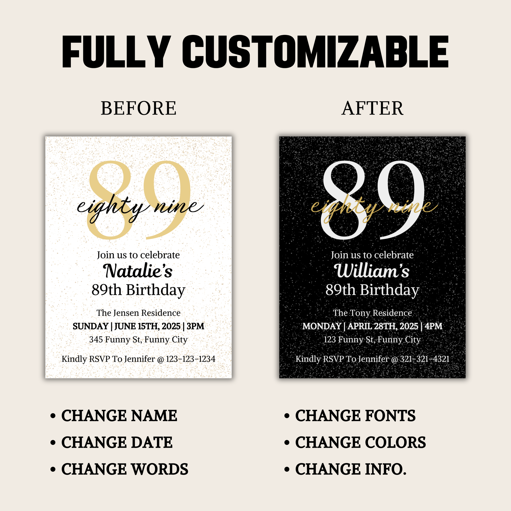89th Birthday Invitation is an editable birthday invitation. You can edit/delete/add any words you like. Available in US Letter size(8.5" x 11") and (11" x 8.5").