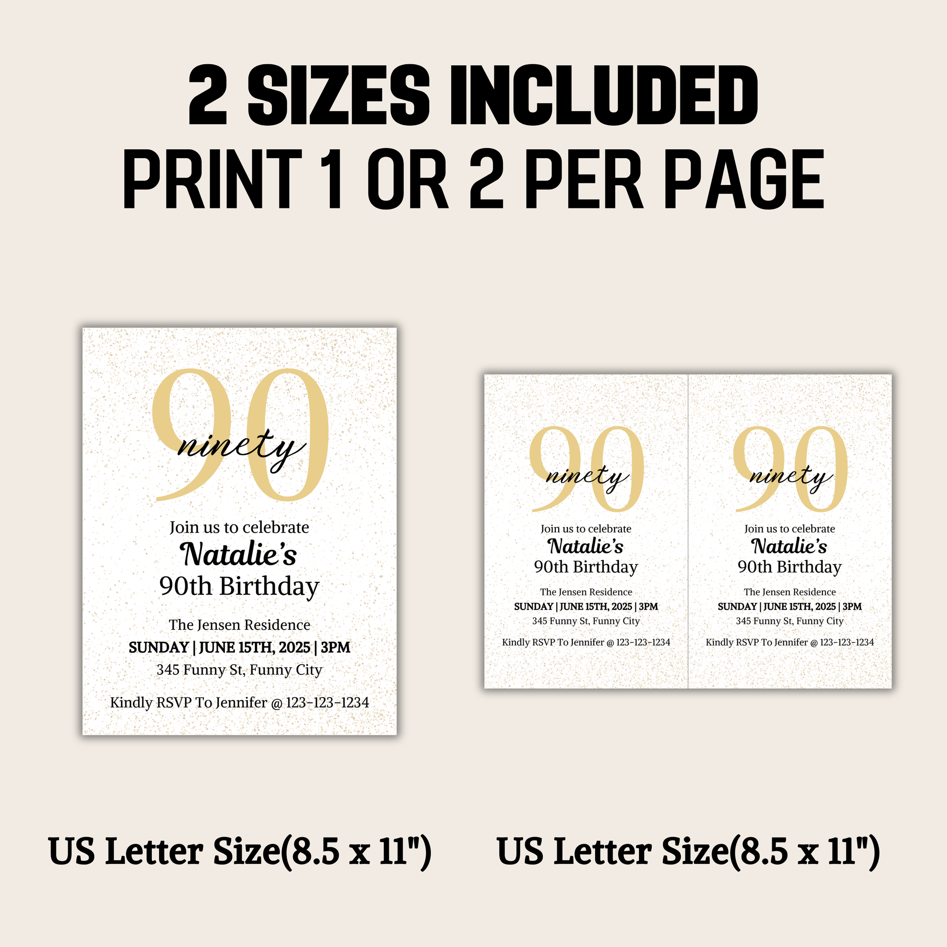 90th Birthday Invitation is an editable birthday invitation. You can edit/delete/add any words you like. Available in US Letter size(8.5" x 11") and (11" x 8.5").