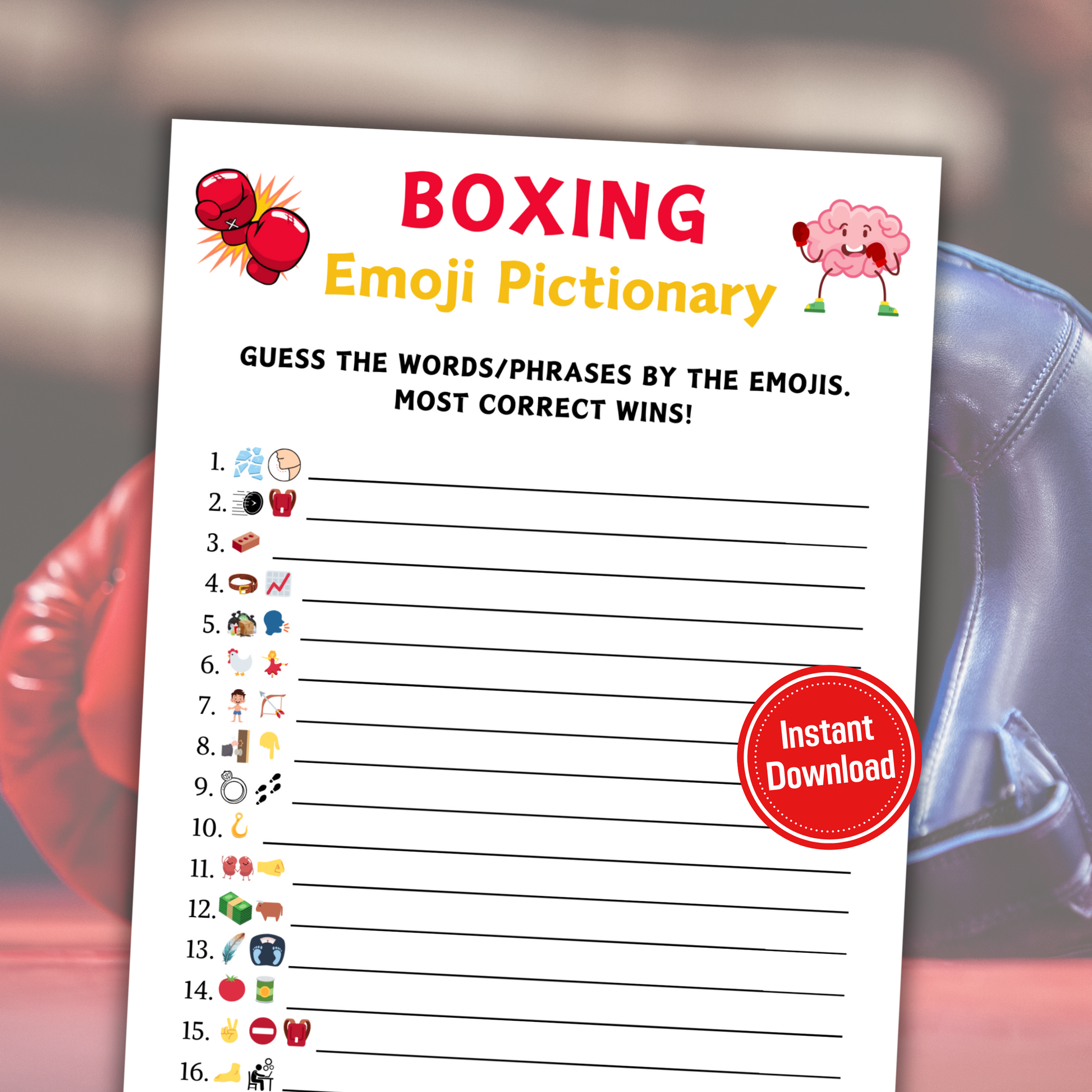 Energize your game night with the Boxing Emoji Pictionary Game! This dynamic activity combines the excitement of boxing with the creativity of emojis. Challenge yourself to interpret boxing-inspired phrases through emoji clues, featuring swift punches, clever uppercuts, and decisive knockouts.