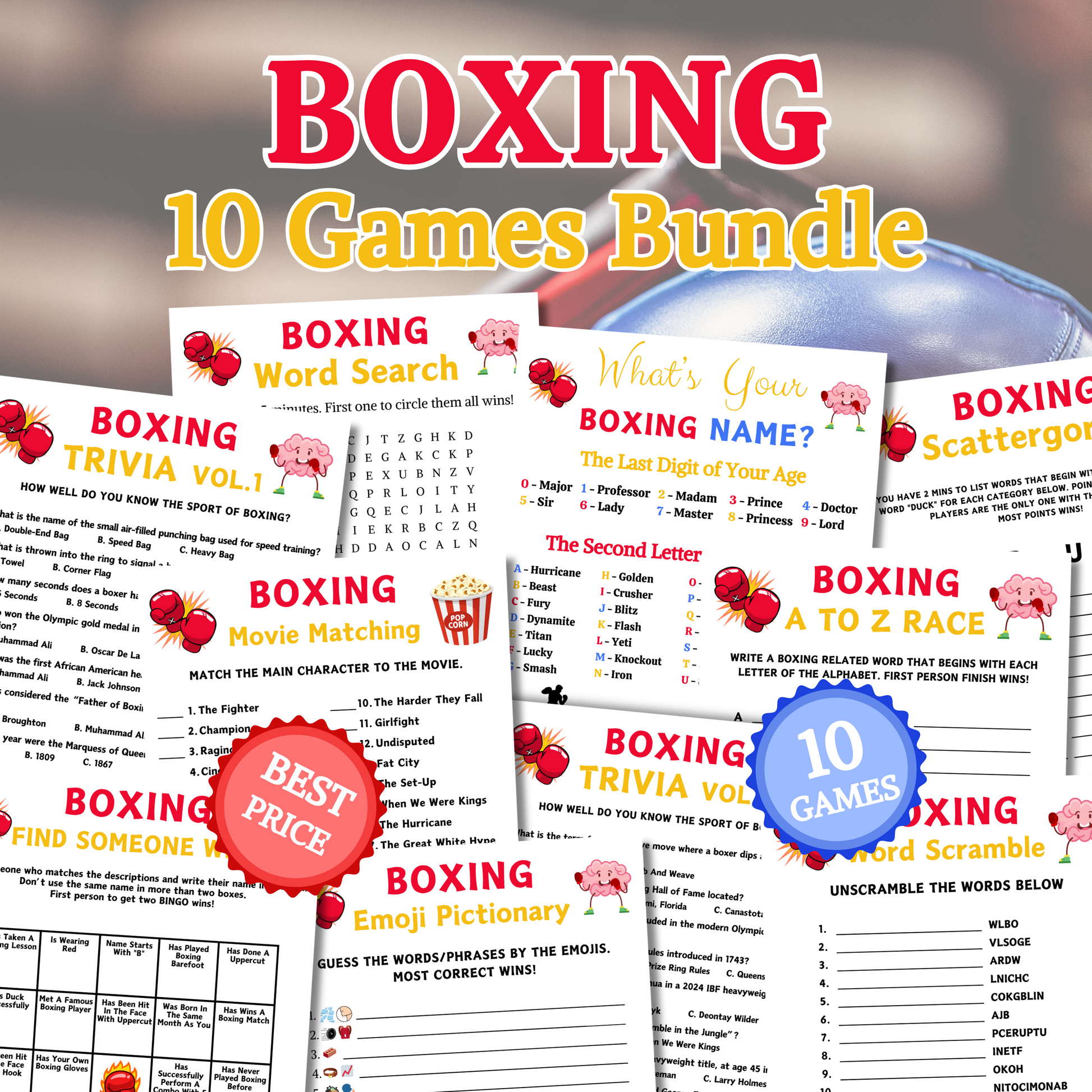 Hey there, boxing champs! Step into the ring with our knockout Boxing Games Bundle! Packed with thrilling games like Boxing Trivia Game, Boxing Word Search Game, Boxing Find Someone Who Game, and more, this bundle is a total TKO for fun. Perfect for fight night parties, gym hangouts, or bonding with your sparring crew, itβs the ultimate way to jab boredom and deliver a punch of excitement!