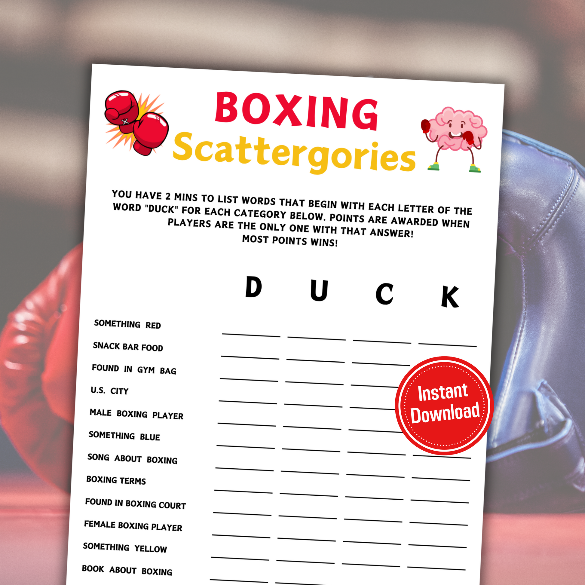 Boxing Scattergories Game is a party game. You have 2 mins to list words that begin with each letter of the word "DUCK" for each category below. Points are awarded when players are the only one with that answer! Most points wins!
