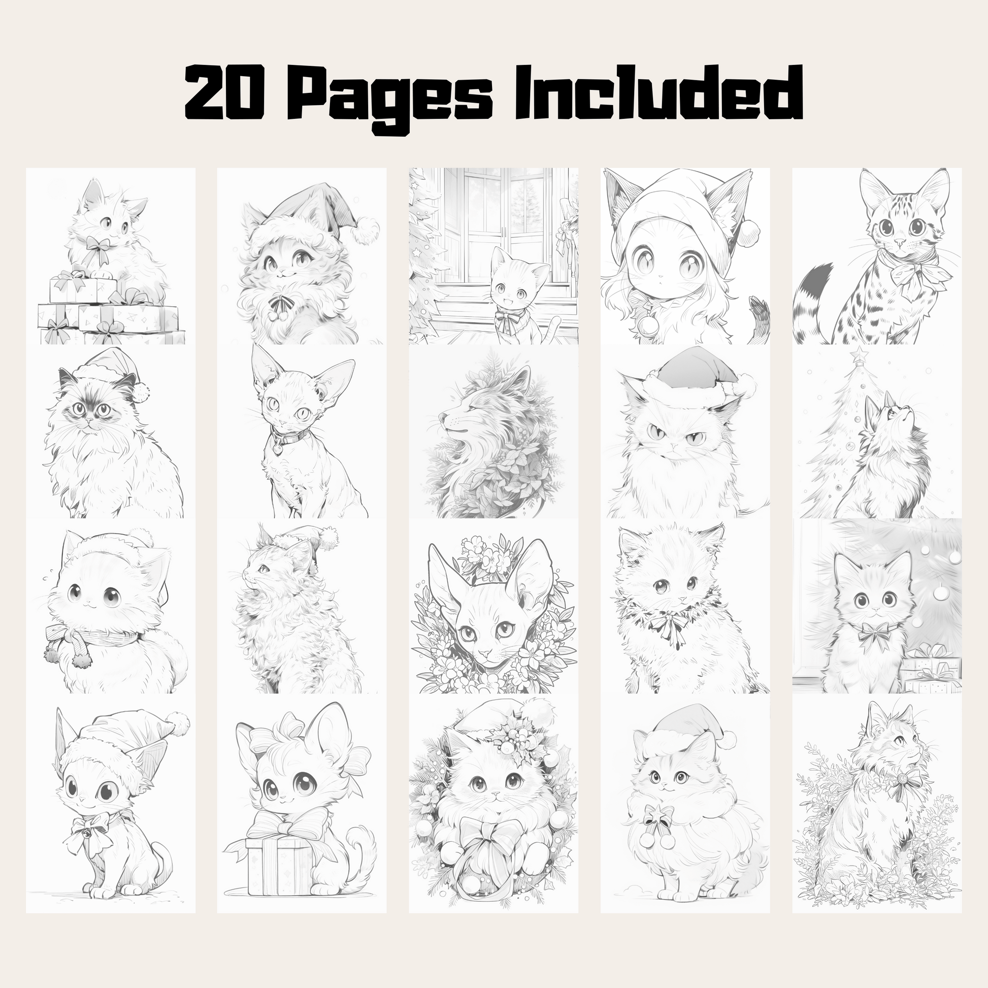 Christmas Cats Coloring Book, 20 Unique Cat Grayscale Coloring Pages for All Ages