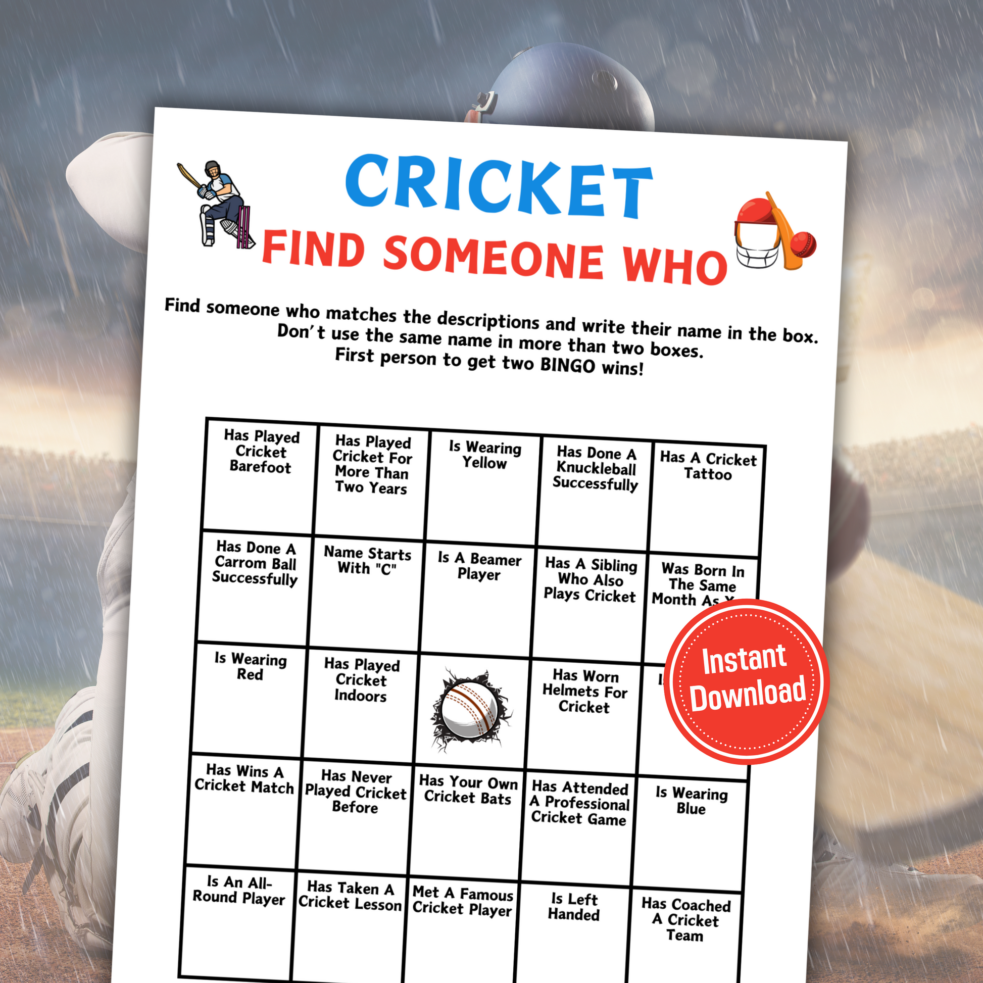Hit a winning shot with our Cricket Find Someone Who Game! Designed for cricket fans, this engaging activity encourages players to identify guests fitting cricket-related clues, fostering interaction and camaraderie. Ideal for sports-themed parties, corporate team-building, or informal get-togethers, it delivers dynamic fun and lively engagement inspired by the spirit of the game.