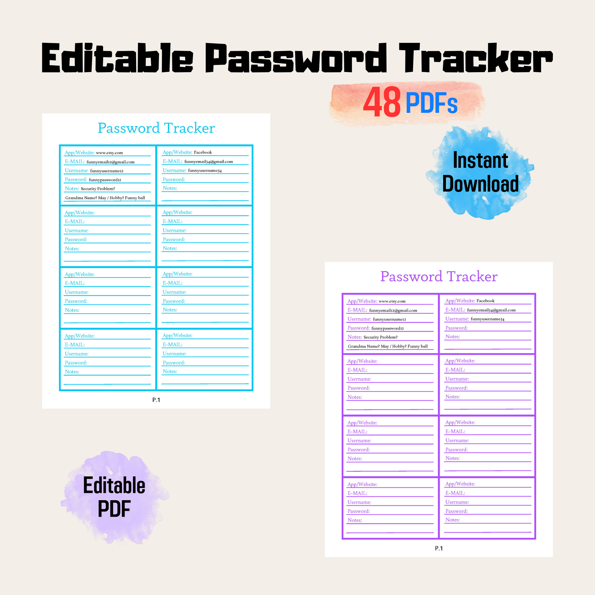 Editable password tracker (rainbow color) is a great way to keep track of website names, usernames and passwords.