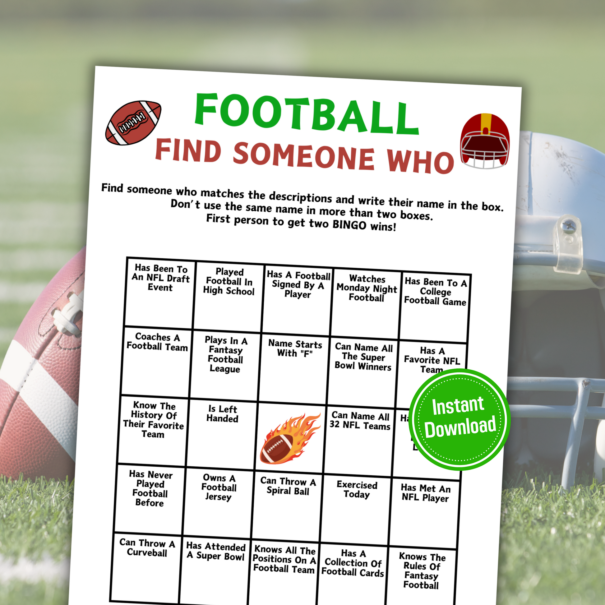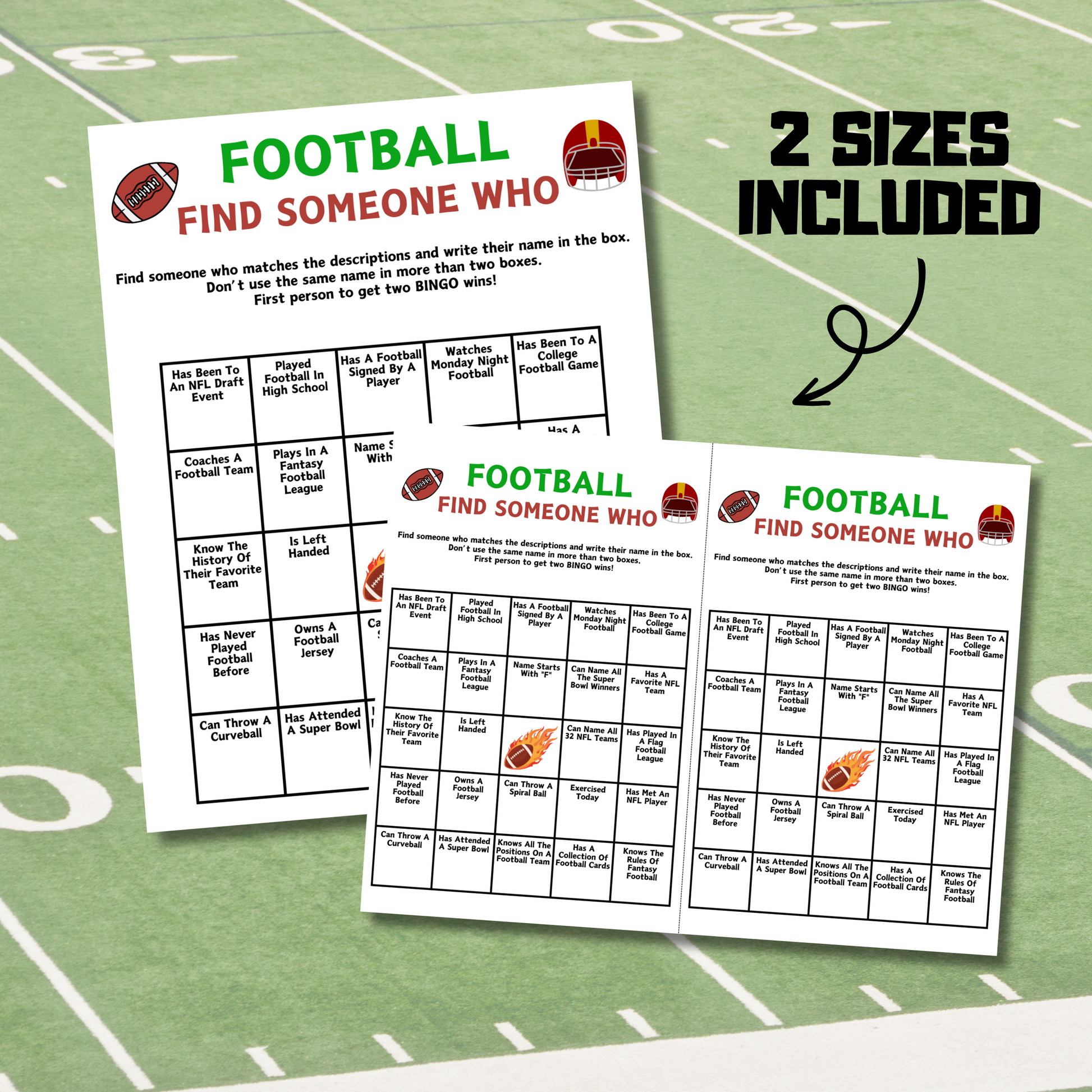 - A file included Football Find Someone Who Game (8.5" x 11").