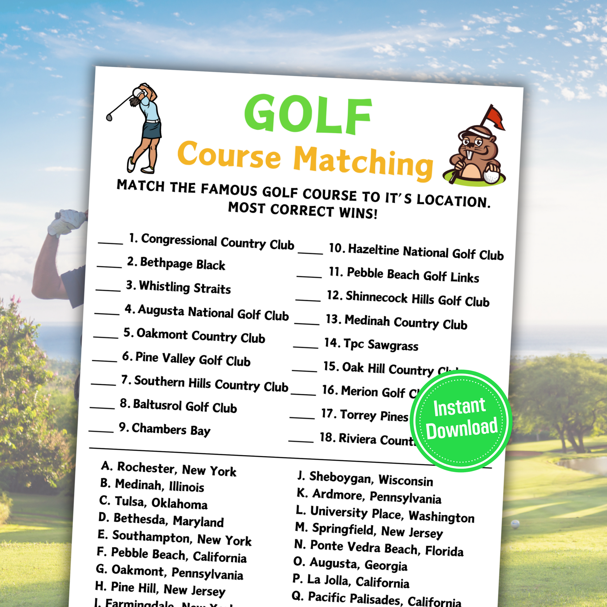 Elevate your gathering with our Golf Course Matching Game, a sophisticated challenge for golf enthusiasts and casual players alike. This printable activity tests your knowledge as you pair renowned golf courses with their distinctive characteristics and historical significance.
