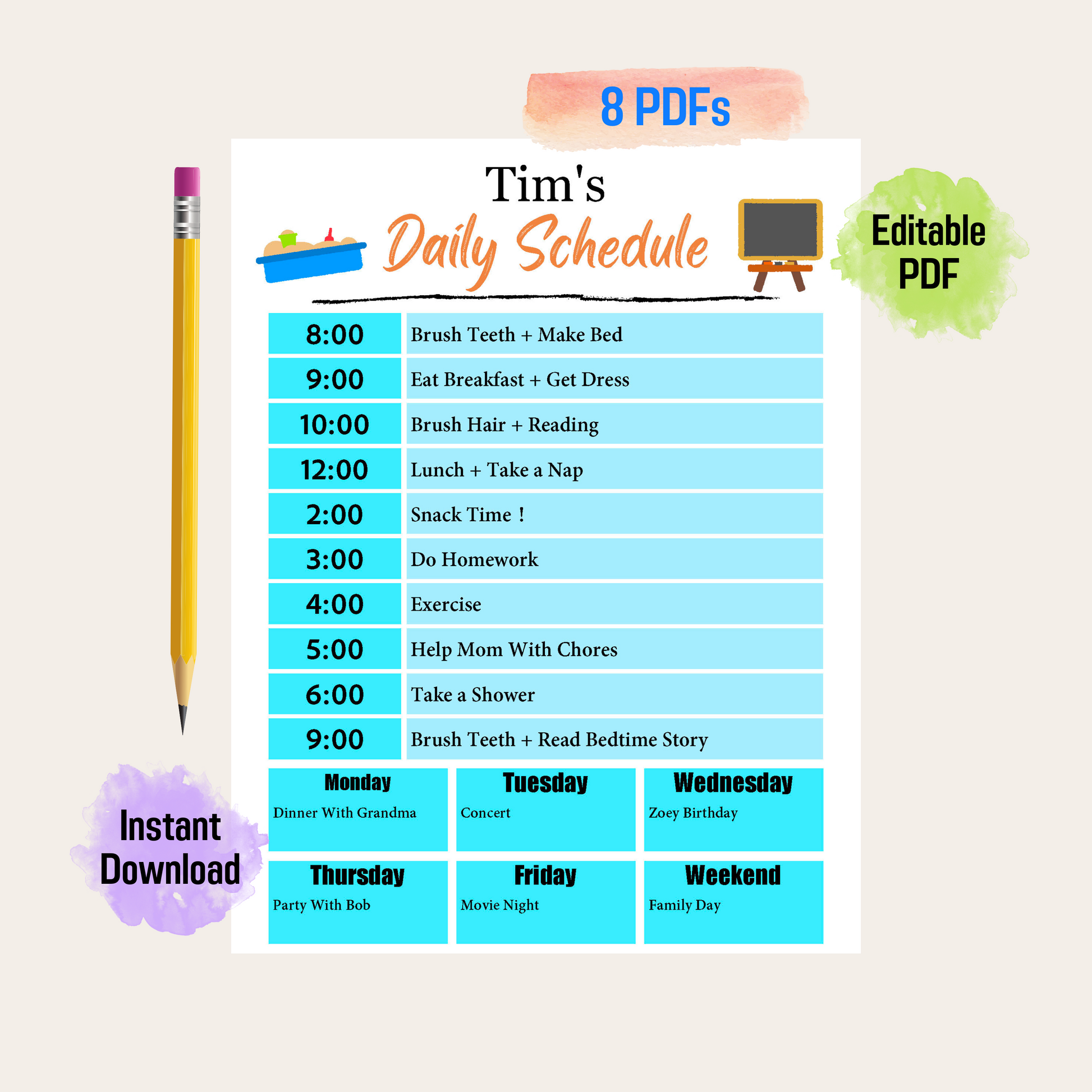 Make sure your kids stay on track and organized with our cute, colorful Kids Fillable Daily Schedule Rainbow Color. This daily responsibility chart will help ensure they remember their daily tasks, routine, and chores! Instantly download to start using it right away!