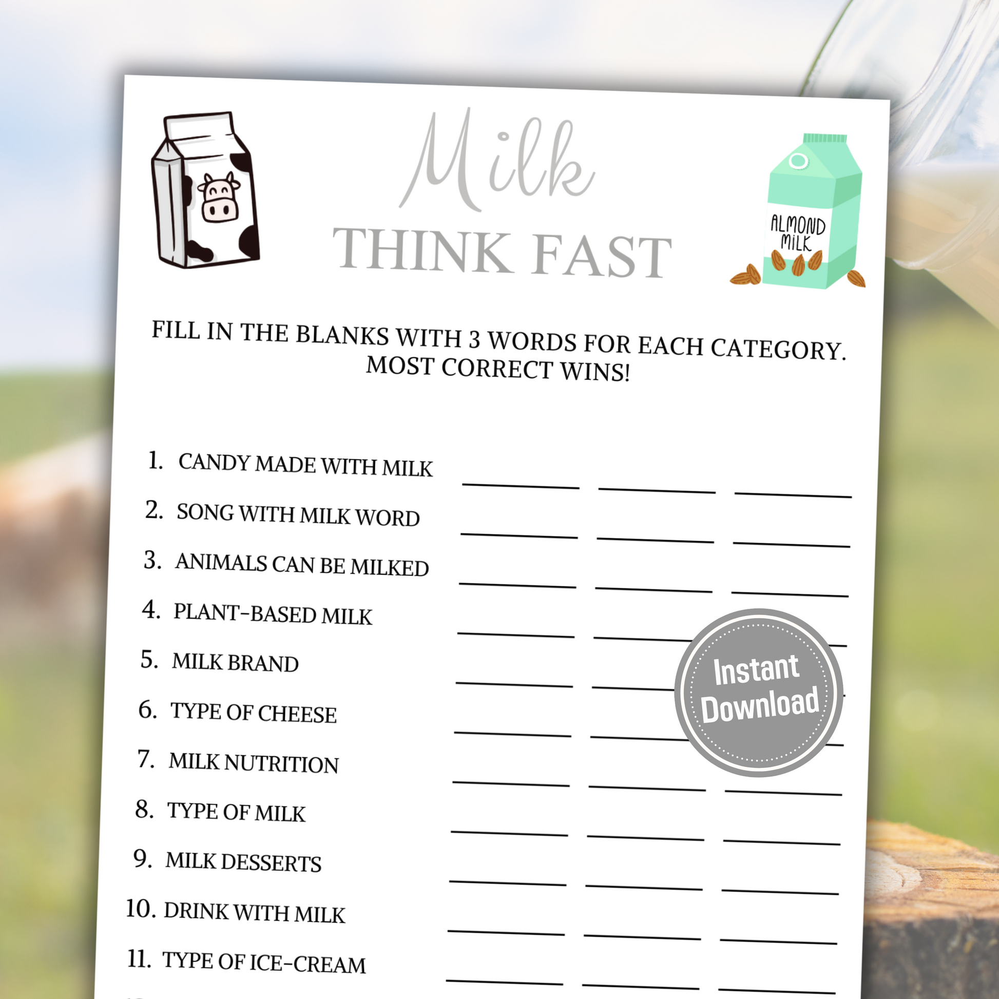 Milk Think Fast Game is a party game. Fill in the blanks with 3 words for each category. Most Correct Wins!