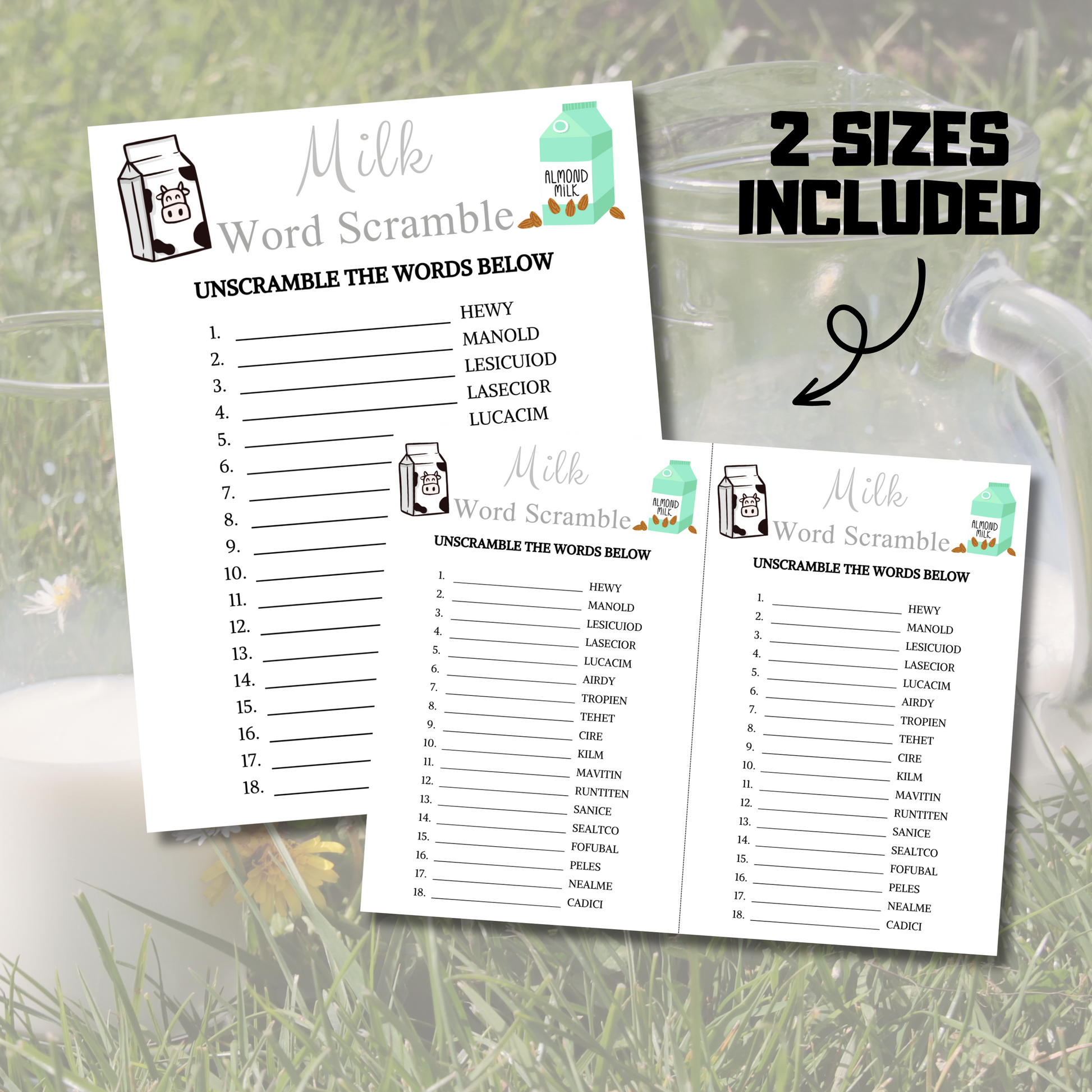 - A file included Milk Word Scramble Game (8.5" x 11") (Answer Book).