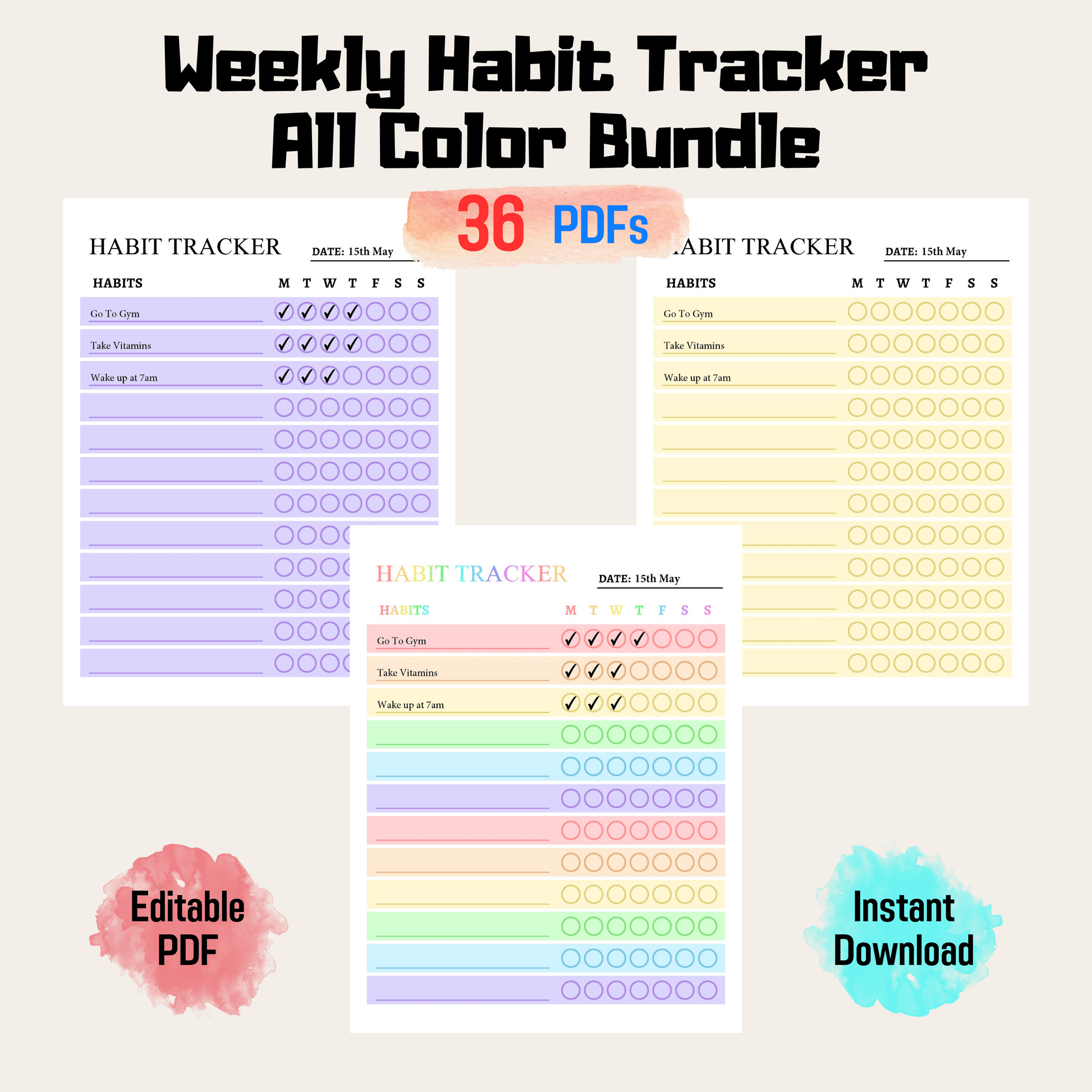 Minimalistic weekly habit tracker (rainbow color) allows you to track your progress towards your goals and develop healthy habits that stick.