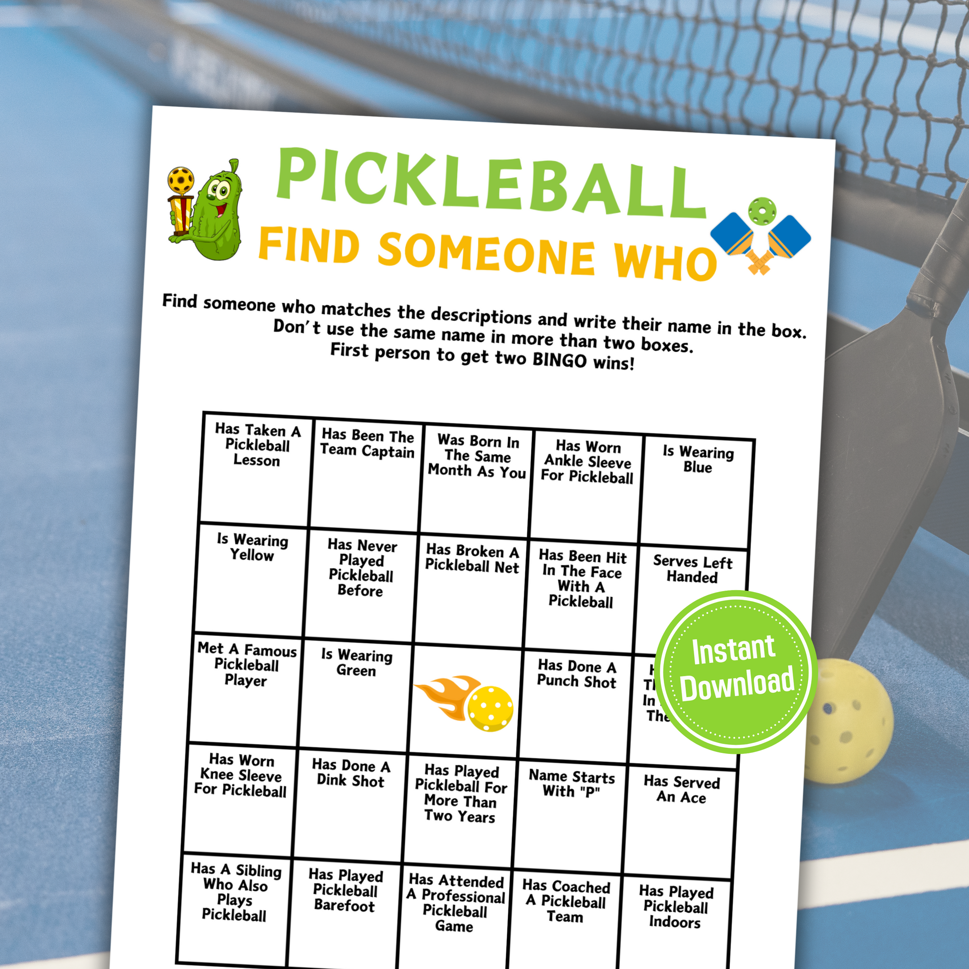 - A file included Pickleball Find Someone Who Game (8.5" x 11").