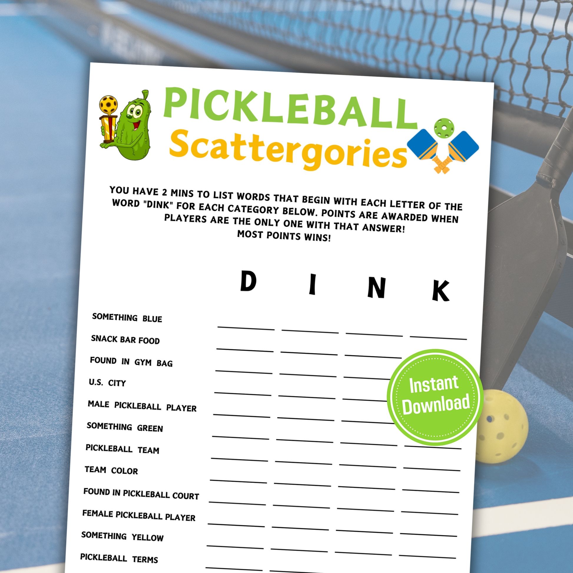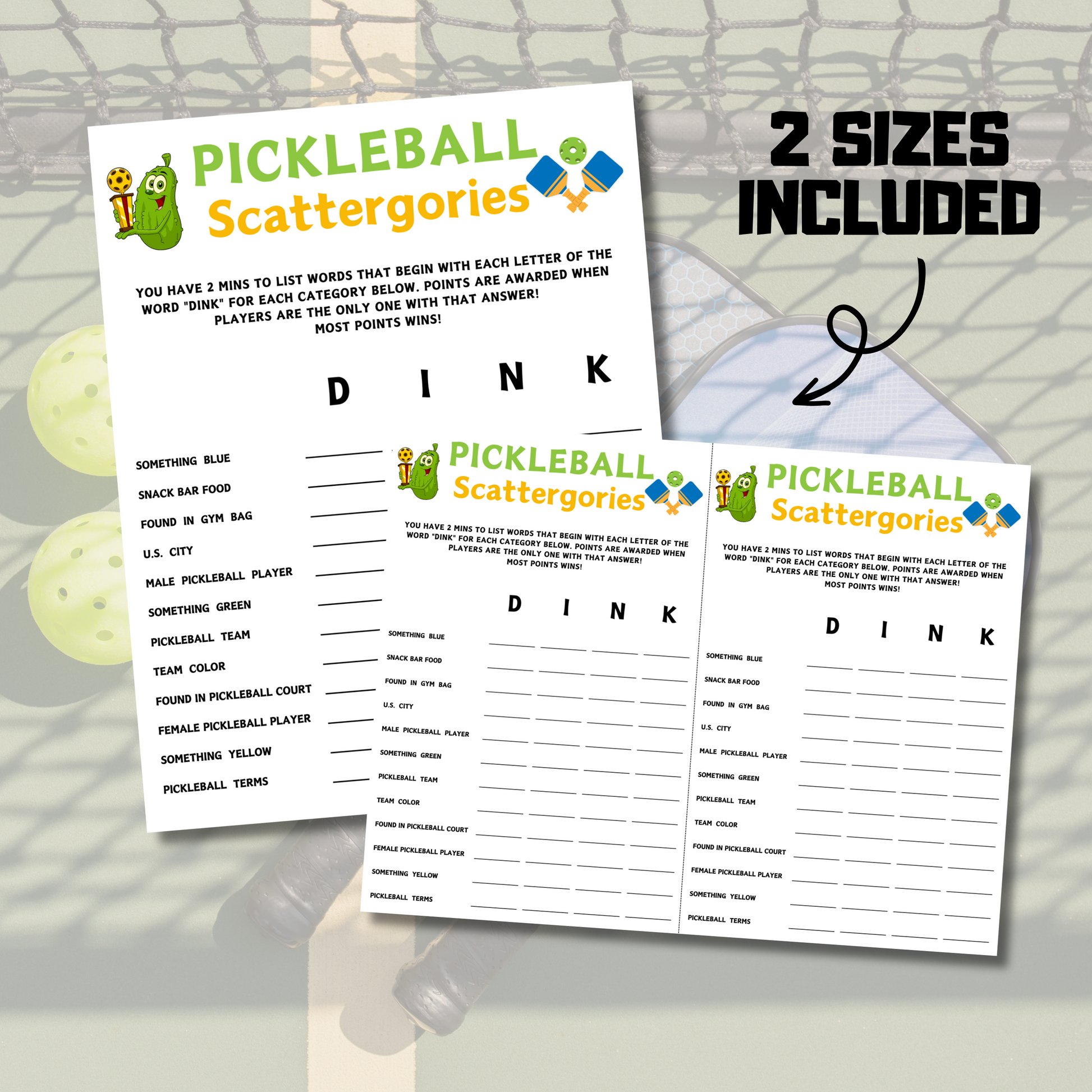 - A file included Pickleball Scattergories Game (8.5" x 11").