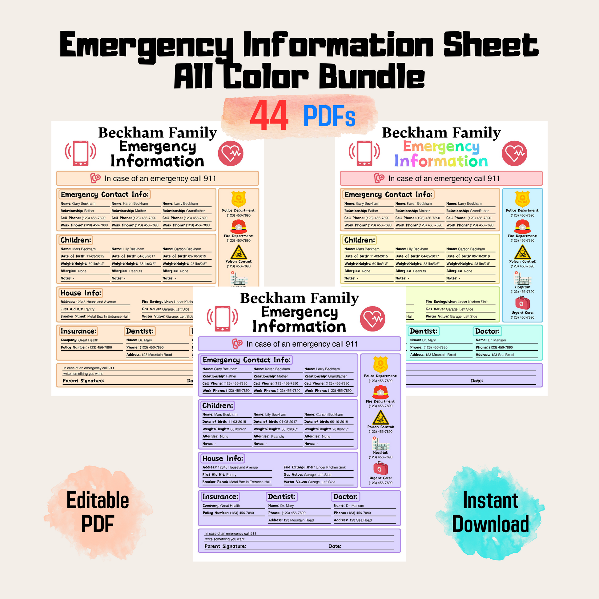 Printable Emergency Information Sheet, Babysitter Info Sheet, Medical Details, Personal Contact Info, Instant Download