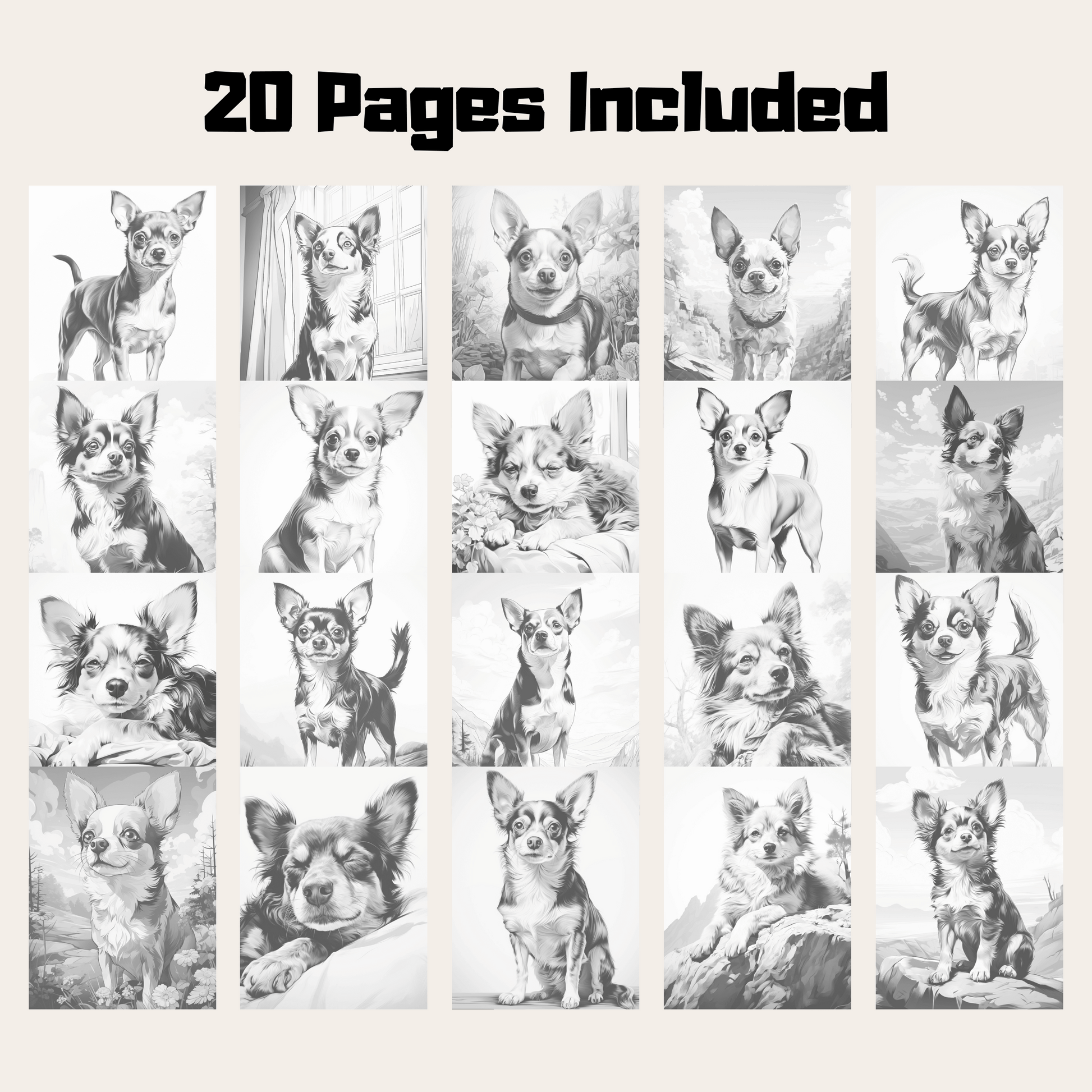 Realistic Chihuahua Coloring Book, 20 Realistic Style Dog Grayscale Coloring Pages