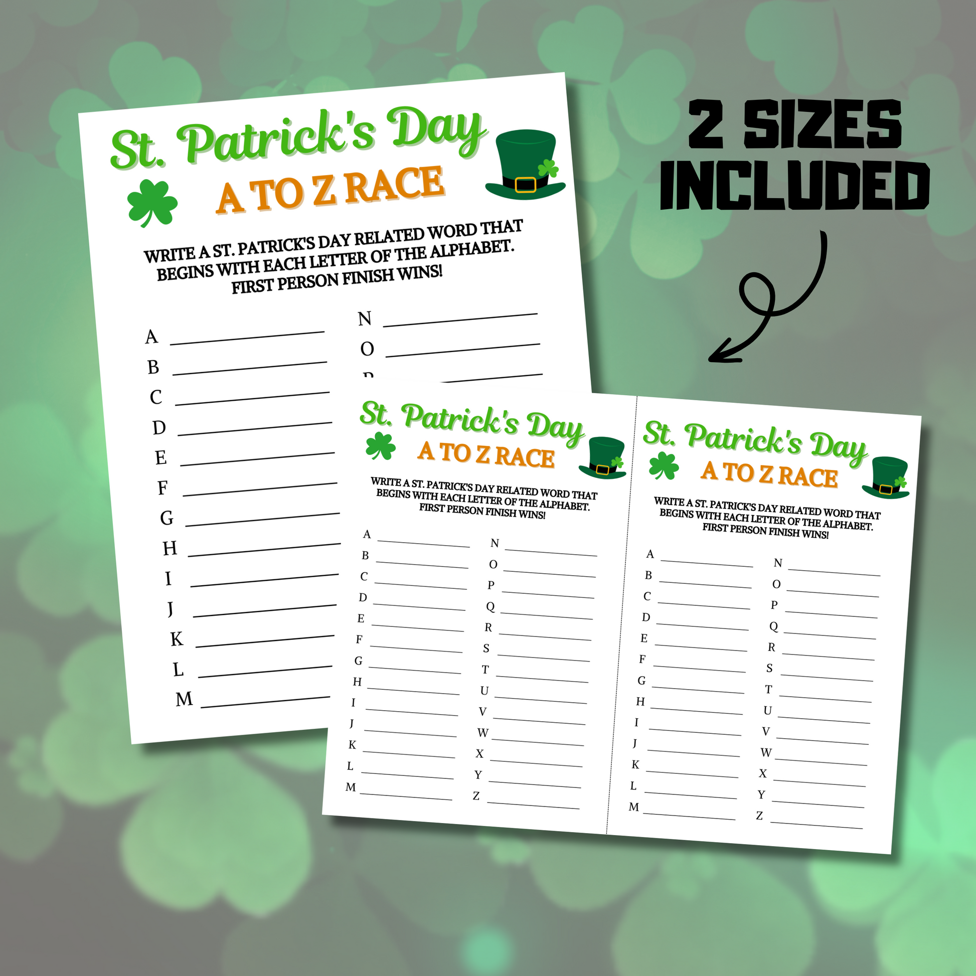 - A file included St. Patrick's Day A To Z Race Game 2 Game Cards per Pages (11" x 8.5").