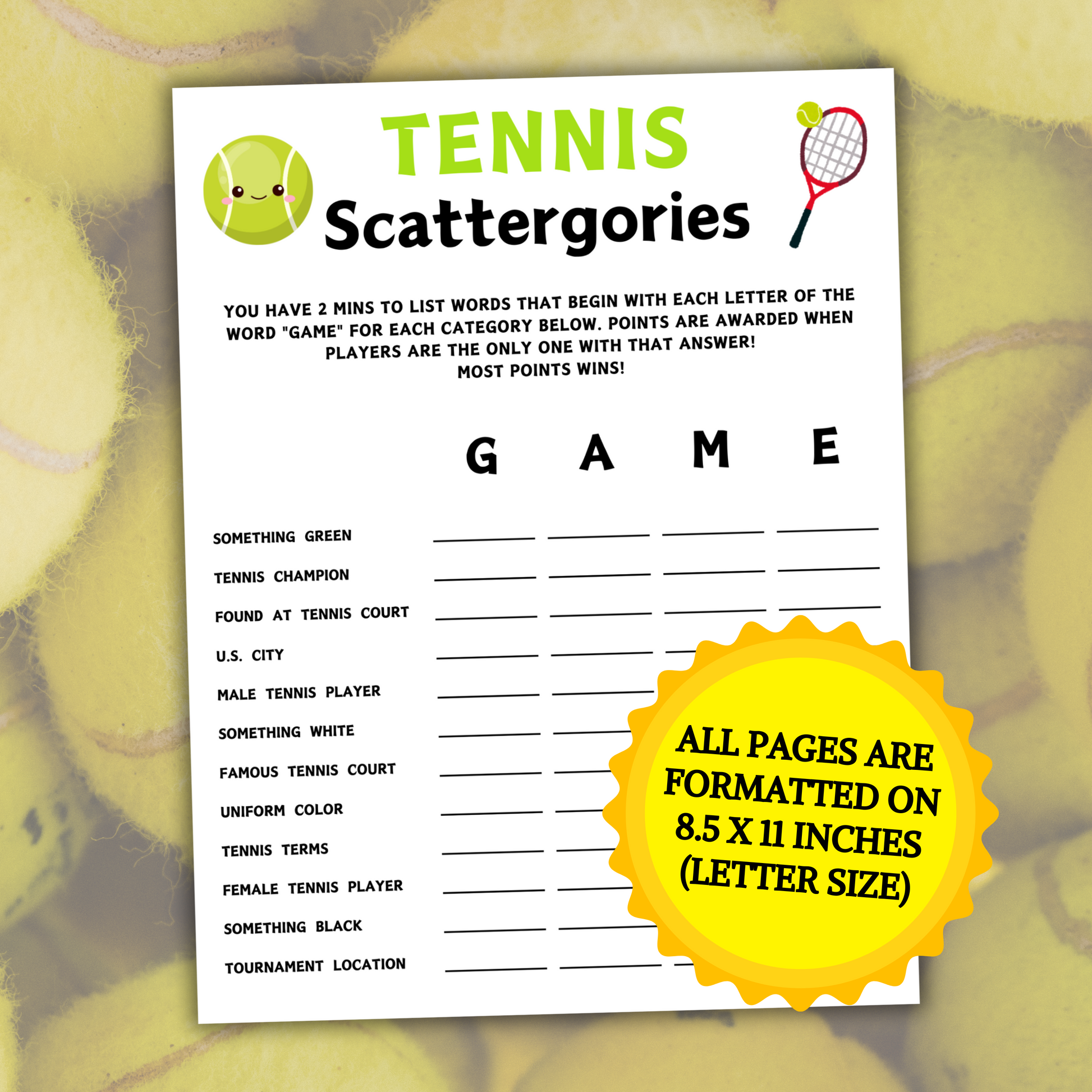 - A file included Tennis Scattergories Game (8.5" x 11").