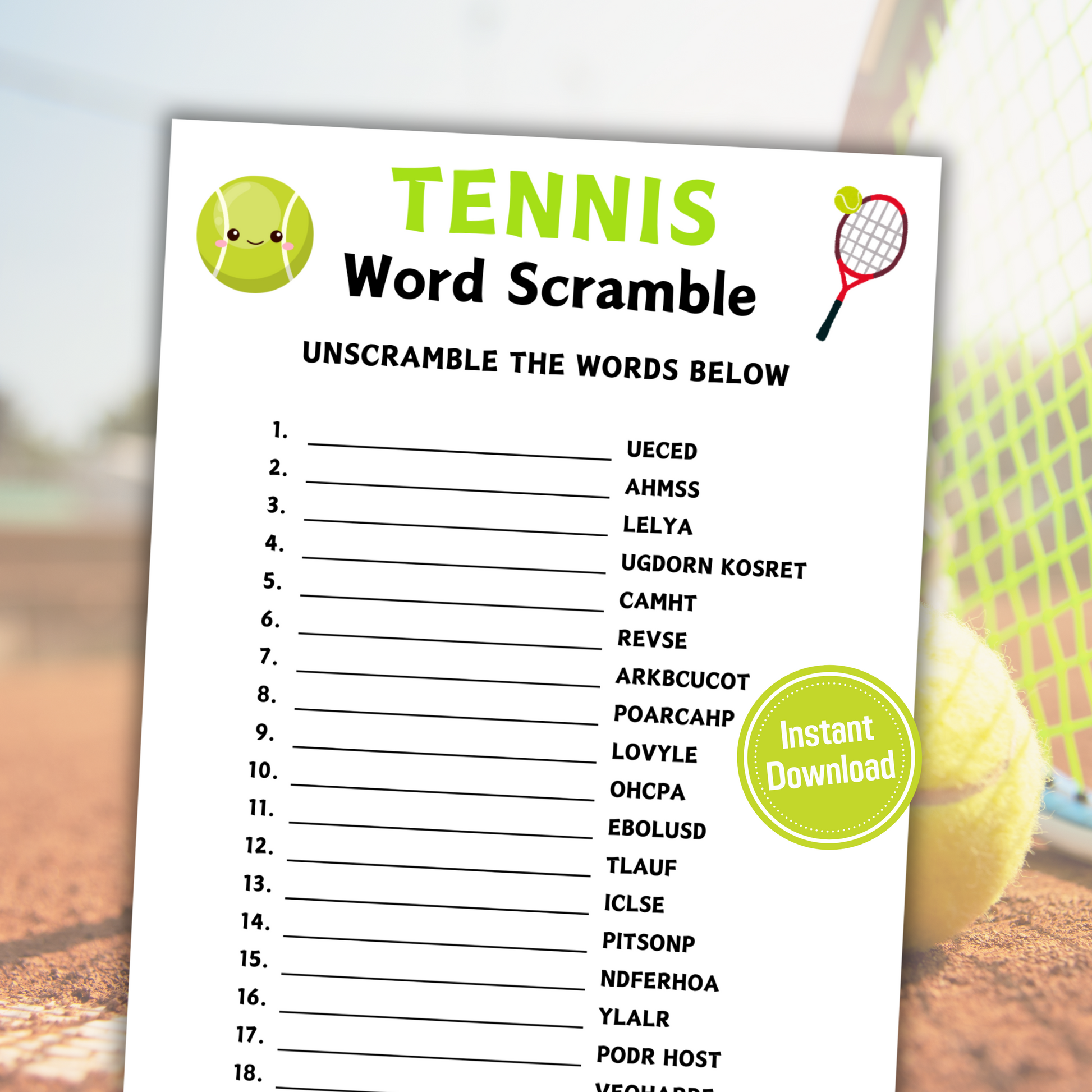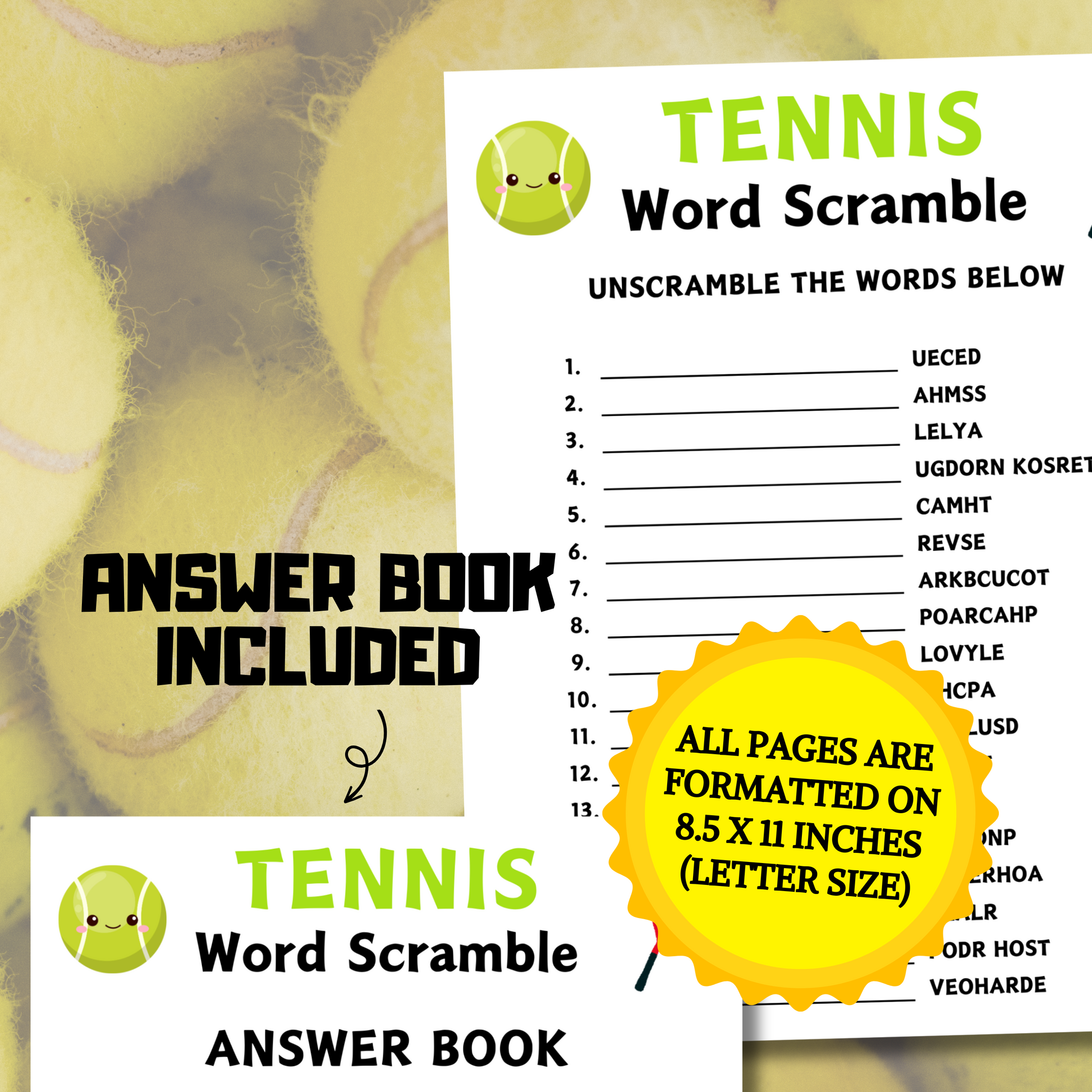 - A file included Tennis Word Scramble Game (8.5" x 11") (Answer Book).