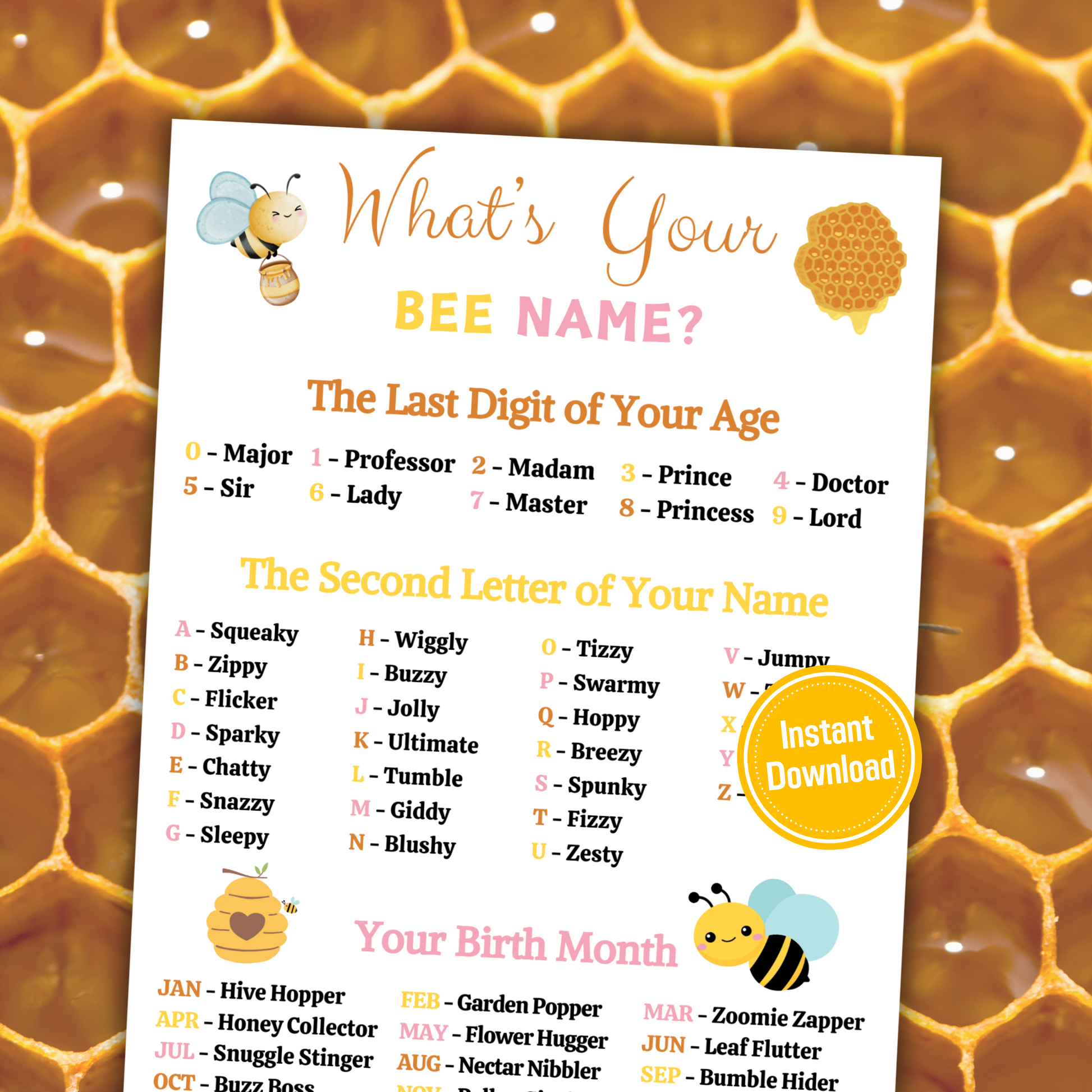 - A file included What's Your Bee Name Game (8.5" x 11").