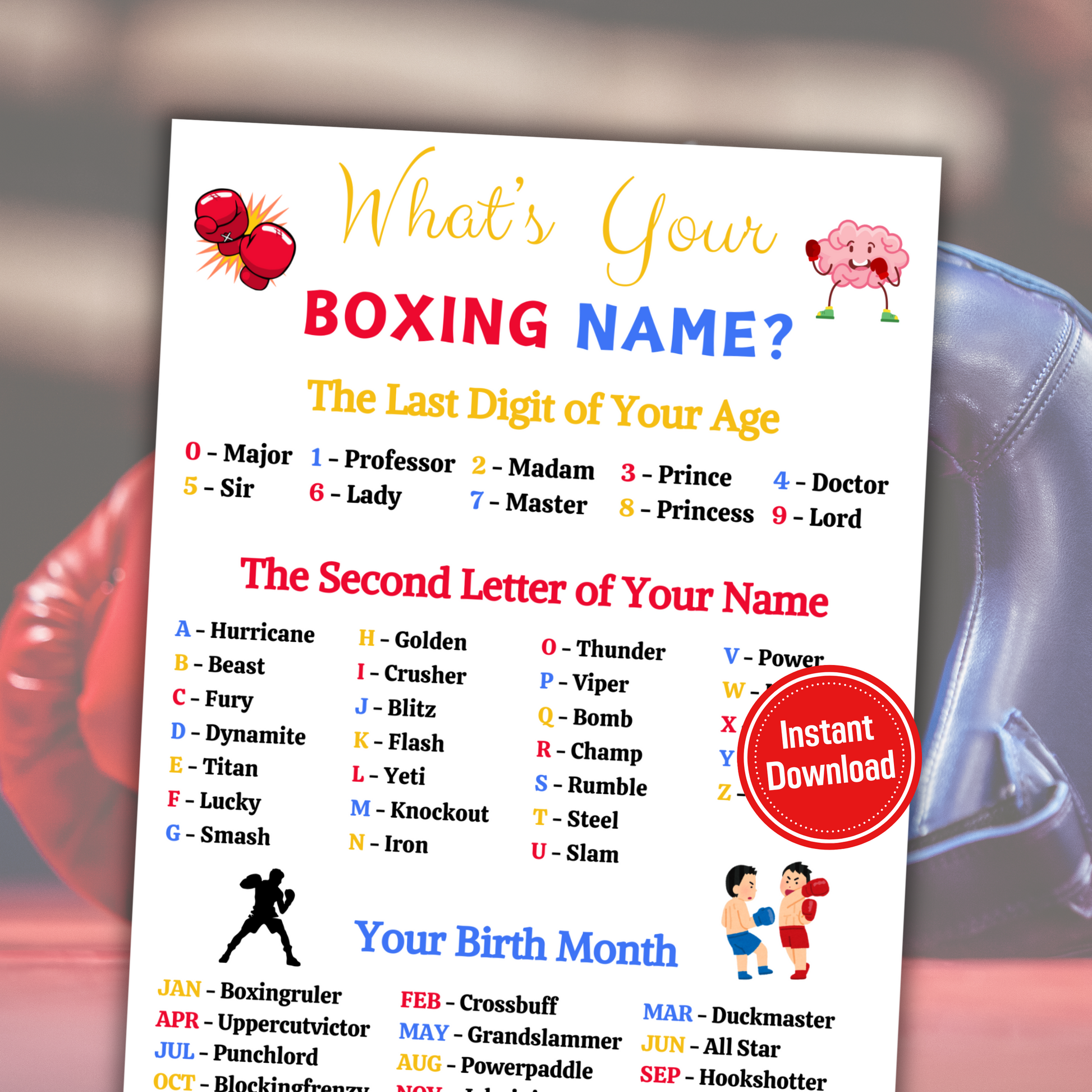 Elevate your event with the "What's Your Boxing Name Game," a must-have for boxing enthusiasts and party hosts alike. This engaging activity reveals your personalized boxing name, creating moments of fun and camaraderie. Perfect for game nights, team-building exercises, or lively get-togethers, it guarantees dynamic interaction and memorable entertainment.