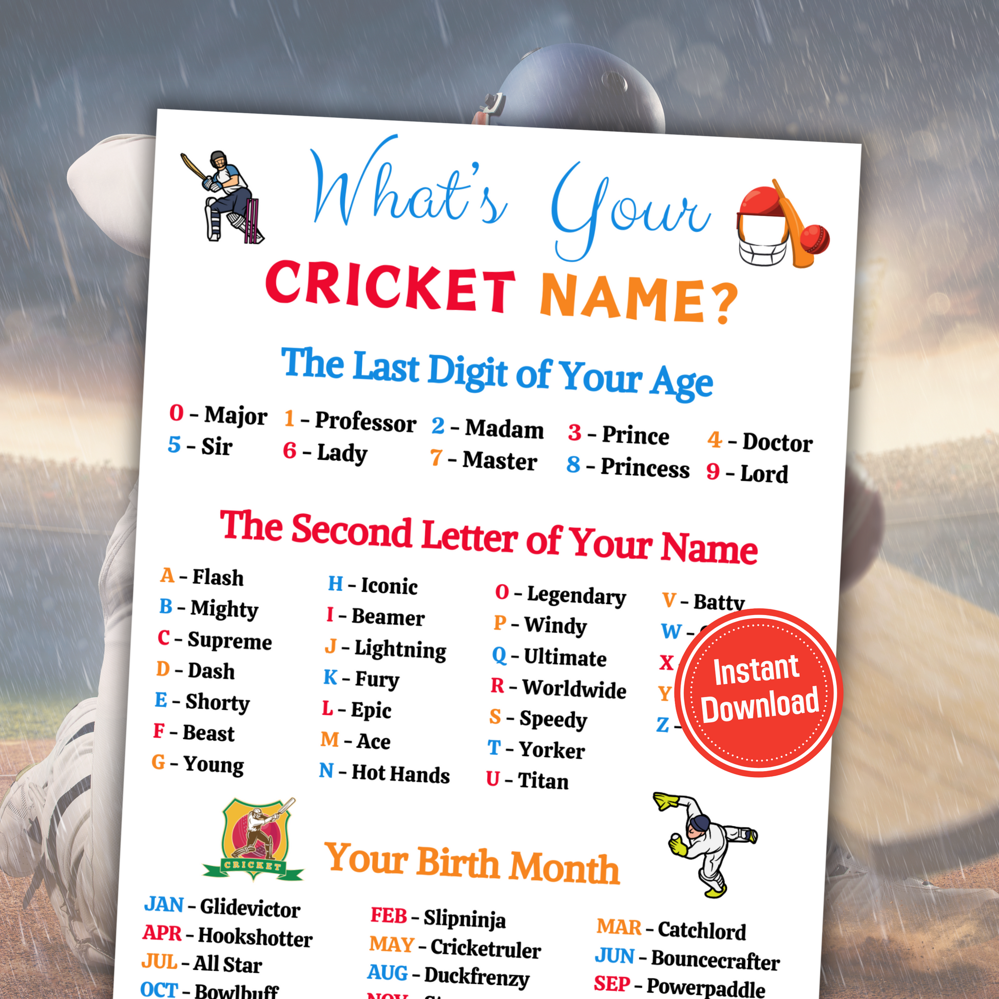 Step up to the crease with our "What's Your Cricket Name Game"! Designed for cricket fans and social events, this printable game delivers authentic pitch-side fun. Uncover your personalized cricket name, guaranteed to inspire smiles and team spirit. Perfect for game nights, corporate bonding, or vibrant get-togethers, this game ensures continuous enjoyment and memorable moments.