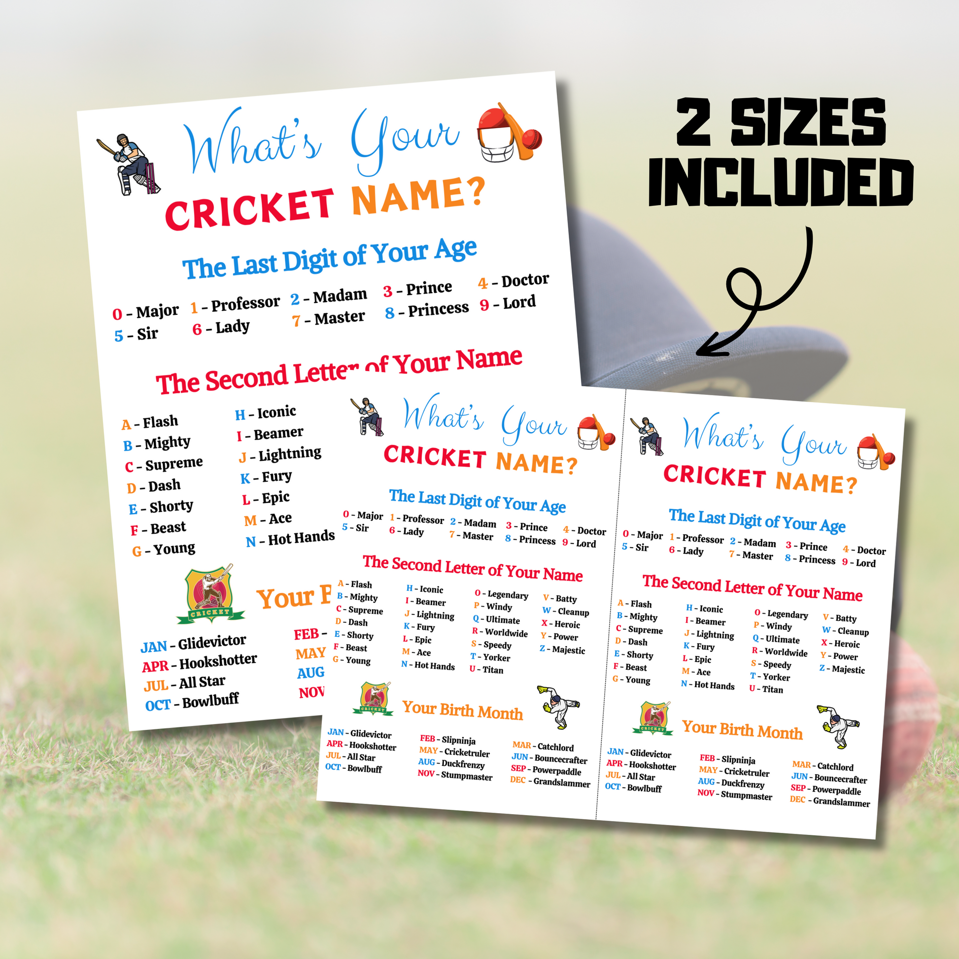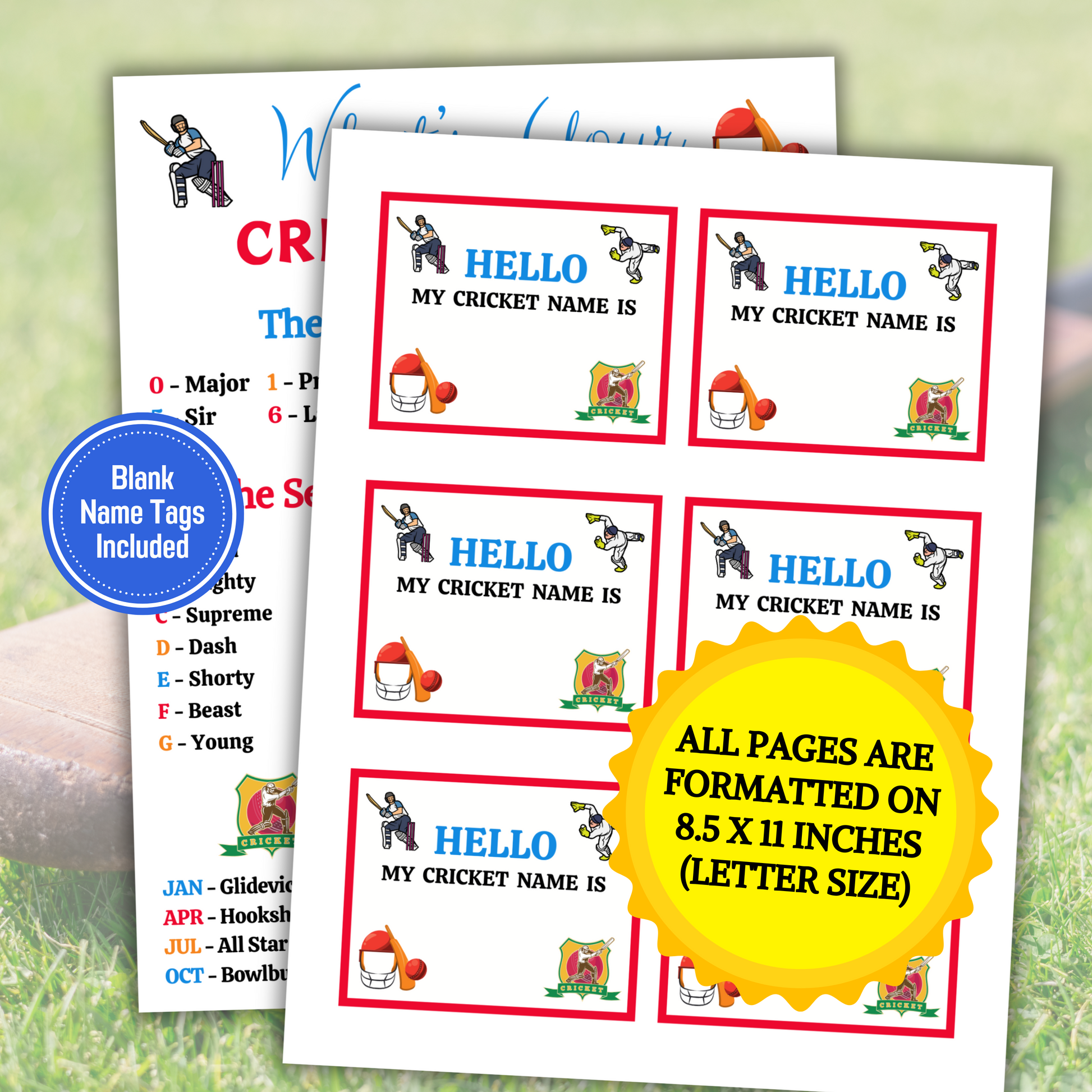 - A file included What's Your Cricket Name Game 2 Game Cards per Pages (11" x 8.5") (Blank Name Tag).