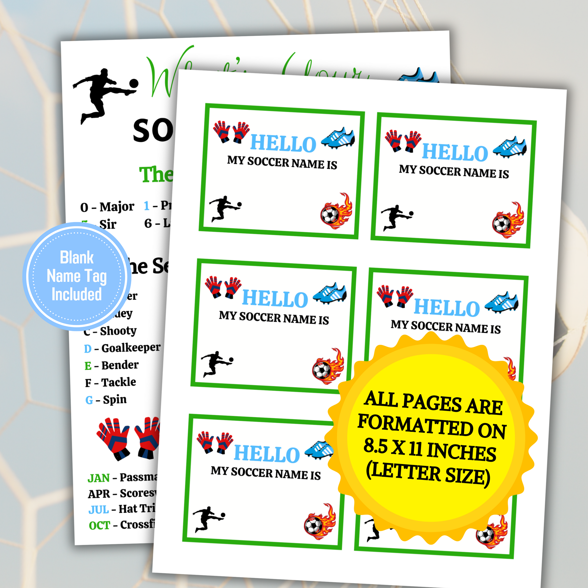 - A file included What's Your Soccer Name Game (8.5" x 11") (Blank Name Tag).