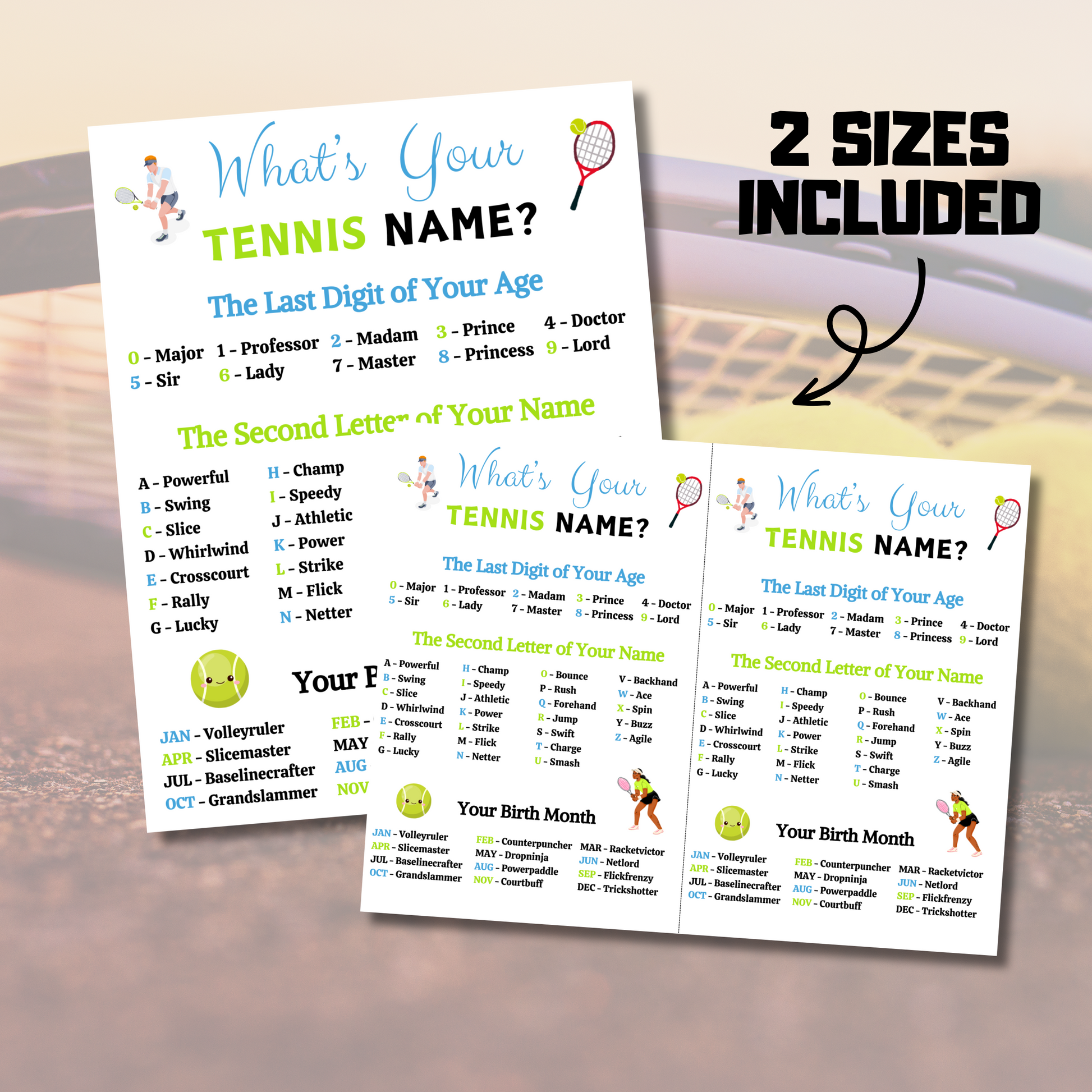 - A file included What's Your Tennis Name Game 2 Game Cards per Pages (11" x 8.5").