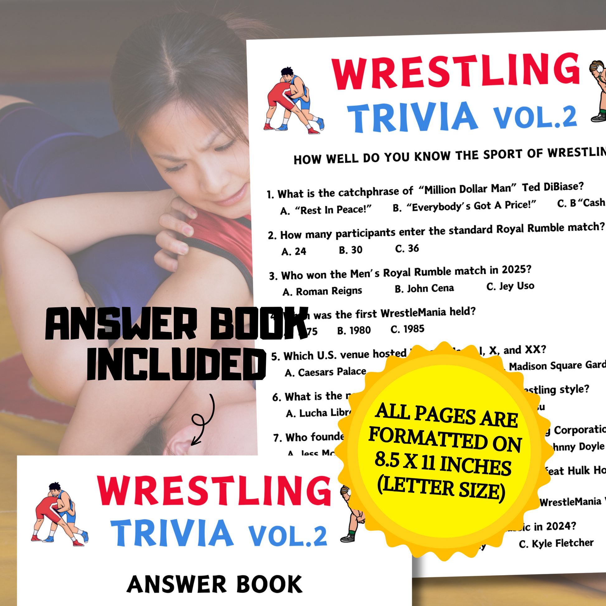 - A file included Wrestling Trivia Game Vol.2 (8.5" x 11") (Answer Book).