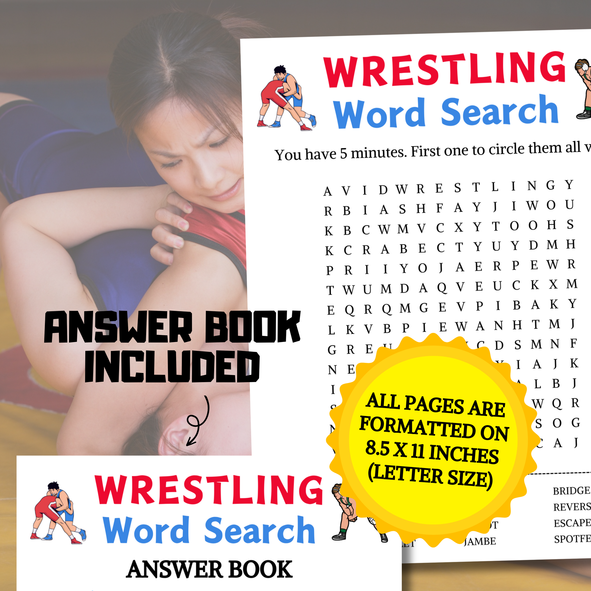 - A file included Wrestling Word Search Game (8.5" x 11") (Answer Book).
